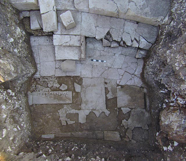 Η αποκάλυψη τριών σειρών μαρμάρινων εδωλίων του κάτω κοίλου (ima cavea) σε άριστη κατάσταση, μεταξύ των οποίων περιλαμβάνονται και εδώλια του προεδρείου, τμήματος της κεντρικής κλίμακας που οδηγεί στο άνω κοίλο (summa cavea) καθώς και της βόρειας εισόδου του θεάτρου (vomitorium), αναθεωρούν σε μεγάλο βαθμό την αρχική υπόθεση, κατά την πρώτη φάση των ερευνών, σχετικά με την κατάσταση διατήρησης του μνημείου. Τότε, η έρευνα είχε αποκαλύψει μόνο μέρος του υποστρώματος των κερκίδων και η παρουσία τριών ασβεστοκάμινων στο εσωτερικό του θεάτρου είχε οδηγήσει στη σκέψη ότι η αρχική κατασκευή αποδομήθηκε, με στόχο τη μετατροπή του δομικού υλικού σε ασβέστη. Με τα μέχρι σήμερα ανασκαφικά δεδομένα, φαίνεται ότι η υφαρπαγή του υλικού συντελέστηκε μόνο στο άνω κοίλο, ενώ διατηρούνται ακόμη αρκετά τμήματα του κάτω κοίλου, αλλά και του δαπέδου της ορχήστρας. Στο τμήμα του δαπέδου που ήλθε πρόσφατα στο φως, μπροστά από τα εδώλια αποκαλύφθηκαν οι εσοχές πολύστιχης ένθετης επιγραφής από μεταλλικά γράμματα στην οποία μεταξύ άλλων διακρίνονται οι λέξεις ΝΙΚΟΠΟΛΕΙ ΙΕΡΑ, ενώ κάποιες εκ των εσοχών διατηρούν κατά χώρα μολύβι και τον χαλκό των ένθετων γραμμάτων. Στο ίδιο σημείο, αποκαλύφθηκε πληθώρα μαρμάρινων θραυσμάτων, μεταξύ αυτών και ανάγλυφη πλάκα με ιδεαλιστική κεφαλή σε πλάγια όψη.
