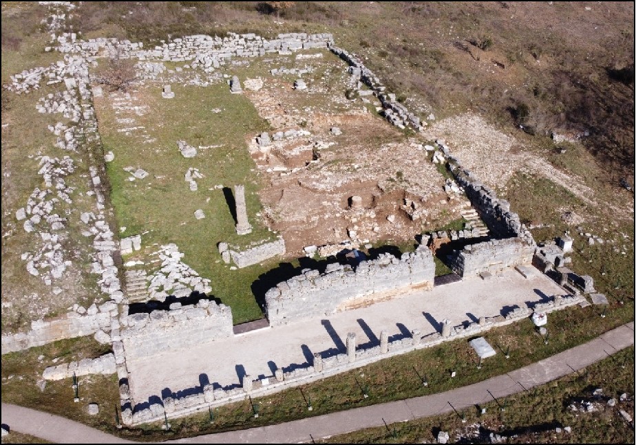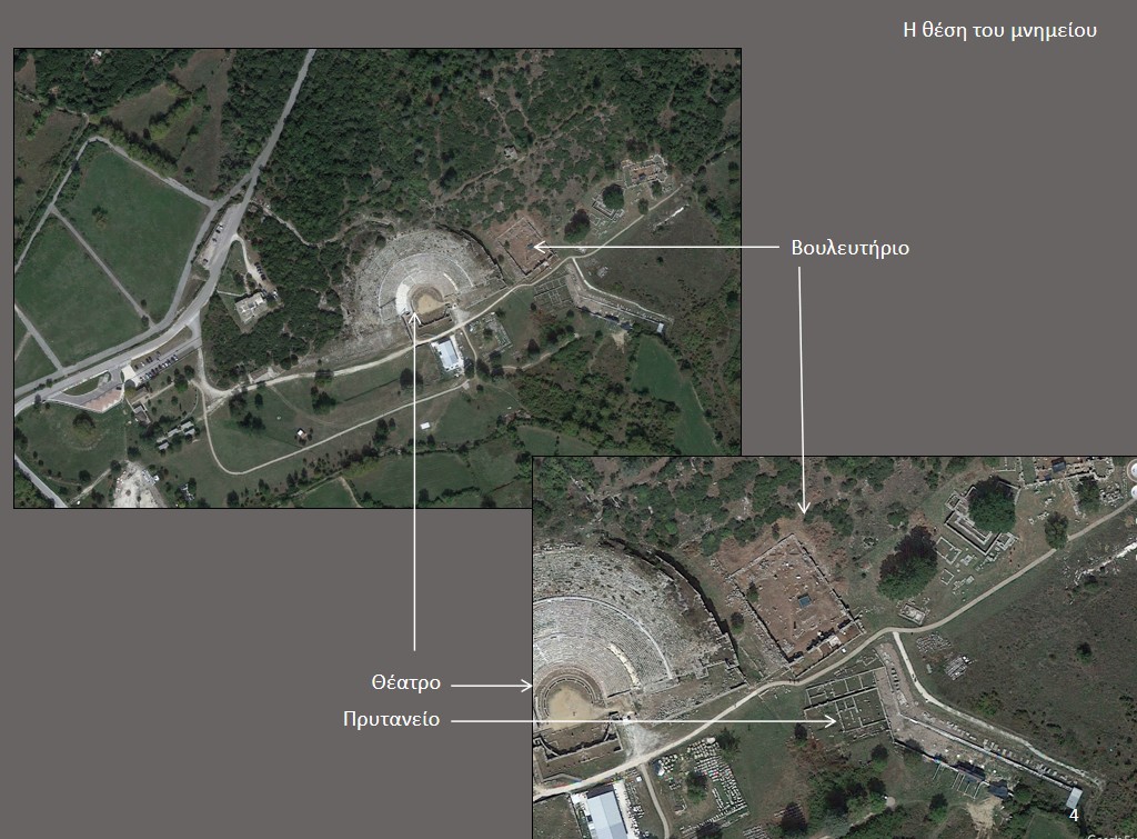 Η χρήση του Βουλευτηρίου συνδέεται με τη Συμμαχία και αργότερα με το Κοινό των Ηπειρωτών. Σήμερα βρίσκεται σε κεντρική θέση του οργανωμένου επισκέψιμου αρχαιολογικού χώρου. Το οικοδόμημα ήταν μεγάλων διαστάσεων με ενιαία στέγη, με τρεις σειρές κιόνων, δωρική στοά με 15 κίονες στη νότια πλευρά, εσωτερικό κοίλο με αναβαθμούς και είσοδο από δύο μεγάλα ανοίγματα, με ασβεστολιθικά κατώφλια. Το Βουλευτήριο έχει τρεις κύριες οικοδομικές φάσεις. Η πρώτη τοποθετείται χρονικά στις αρχές 3ου αιώνα π.Χ. επί βασιλείας Πύρρου, στο πλαίσιο ενός μεγάλου οικοδομικού προγράμματος που περιλάμβανε το Βουλευτήριο, το Πρυτανείο, το Θέατρο και το Στάδιο. Η δεύτερη οικοδομική φάση χρονολογείται μετά την αιτωλική καταστροφή (219 π.Χ.), και η τρίτη μετά τη ρωμαϊκή επέμβαση (167 π.Χ.), οπότε το Βουλευτήριο επισκευάστηκε και συνέχισε να λειτουργεί. Στα ύστερα ρωμαϊκά χρόνια, η περιοχή συνέχισε να λειτουργεί, αλλά με άλλη χρήση. Οι τέσσερις τάφοι που έχουν εντοπιστεί ανήκουν σε αυτή τη φάση. Η τελική καταστροφή του κτηρίου τοποθετείται στον μεγάλο σεισμό του 522–528 μ.Χ.