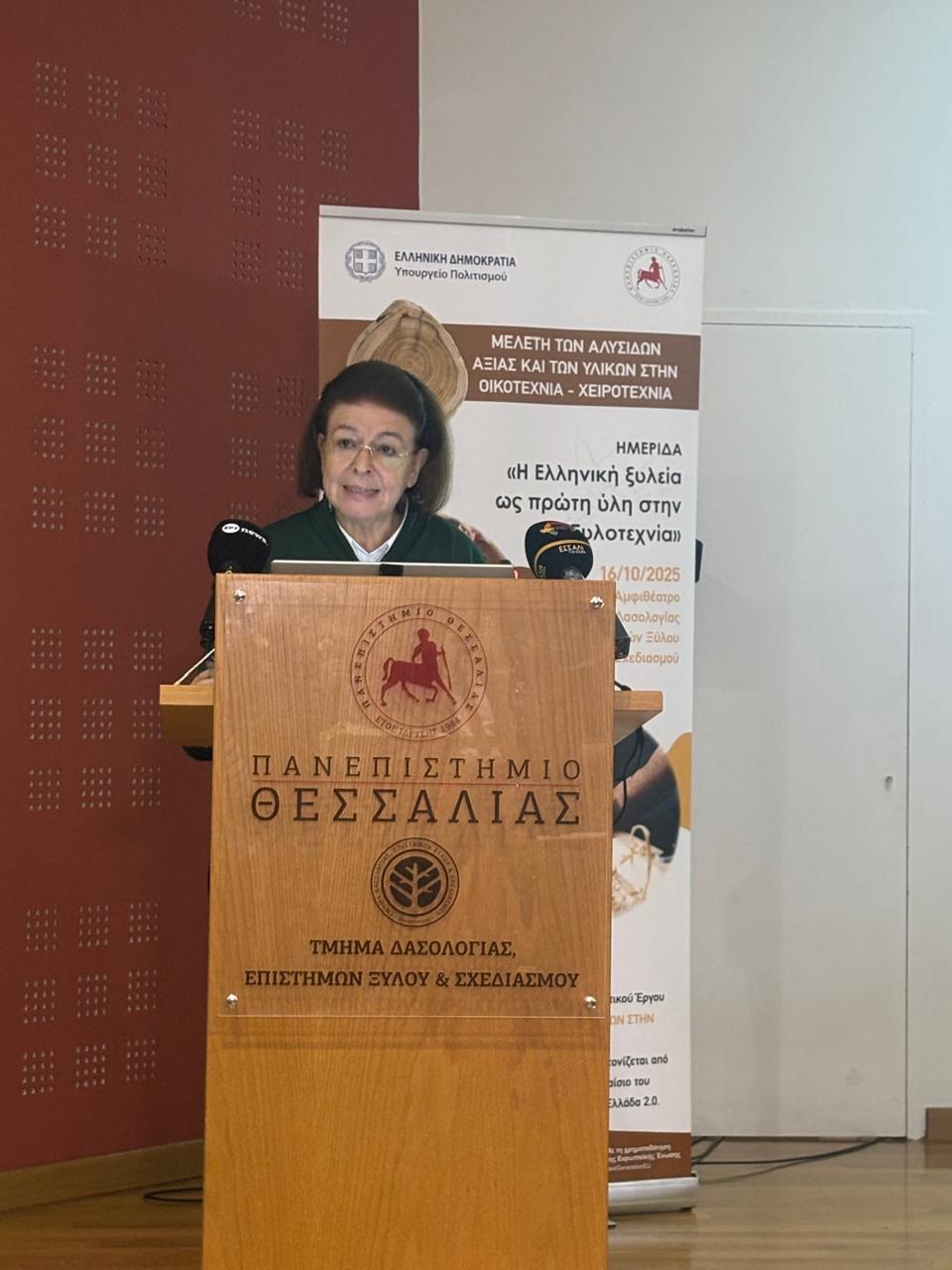 Η Λίνα Μενδώνη στην ομιλία της ανέφερε: «Είμαι σήμερα, εδώ, με ιδιαίτερη χαρά και είναι, πραγματικά, επιλογή μου να συμμετέχω σε αυτές τις ημερίδες, που διοργανώνει το Υπουργείο Πολιτισμού με τους πανεπιστημιακούς μας εταίρους, γιατί πιστεύω βαθιά στην αξία της αναβίωσης της ελληνικής χειροτεχνίας, η οποία αποτελεί, από το 2019, πολιτική στρατηγική προτεραιότητα του Υπουργείου Πολιτισμού. Δεν μας ενδιαφέρει η χειροτεχνία ως μουσειακό είδος. Μας ενδιαφέρει ως ζωντανό κύτταρο δημιουργίας, ως ένα βιώσιμο αναπτυξιακό πρότυπο, που αντλεί δύναμη από τις παραδοσιακές πρακτικές και μετατρέπεται σε μοχλό ανάπτυξης, απασχόλησης και αναζωογόνησης της ελληνικής περιφέρειας. Το πρόγραμμα που υλοποιούμε σε συνεργασία με τα Πανεπιστήμια Θεσσαλίας, Δυτικής Μακεδονίας και Δυτικής Αττικής, με χρηματοδότηση του Ταμείου Ανάκαμψης, είναι ένα μεγάλο έργο, που ανέδειξε τη δυναμική της χειροτεχνίας και τη σημασία της μεταφοράς της γνώσης παραδοσιακών πρακτικών και τεχνικών, στις νεότερες γενιές. Το έργο είναι πιλοτικό και αφορά στους τομείς της υφαντικής, της κεραμικής και της ξυλοτεχνίας, επαγγέλματα που σιγά-σιγά χάνονται. Μπορούμε τώρα να τα διασώσουμε και να τους δώσουμε νέα ζωή. Κρίσιμη παράμετρος στο έργο είναι η μελέτη των αλυσίδων αξίας των παραδοσιακών πρώτων υλών – μαλλί, ξύλο, άργιλος. Το Υπουργείο Πολιτισμού έχει διαμορφώσει ένα συγκροτημένο στρατηγικό σχέδιο για την αναβίωση των παραδοσιακών τεχνών. Στο πλαίσιο του έργου της αναβίωσης της ελληνικής χειροτεχνίας, ιδρύθηκαν 19 εκπαιδευτικές δομές από την Κρήτη έως τη Θράκη, υπό την εποπτεία των τριών Πανεπιστημίων. Παράλληλα, το Υπουργείο Πολιτισμού ενισχύει την τέχνη της ξυλοναυπηγικής στη Σάμο, την τέχνη της Μαρμαροτεχνίας της Τήνου, την τέχνη της πέτρας με την δημιουργία σχολών Πέτρας στα Λαγκάδια και τον Πεντάλοφο Κοζάνης. Όλα αυτά αποτελούν μέρος του ενιαίου στρατηγικού σχεδίου της κυβέρνησης για τη στήριξη της ελληνικής χειροτεχνίας και της περιφέρειας, με στόχο τη διατήρηση της πολιτιστικής μας ταυτότητας, αλλά και ως συμβολή στην αντιμετώπιση του δημογραφικού προβλήματος. Ο κλάδος της χειροτεχνίας υπήρξε κάποτε πηγή εισοδήματος και απασχόλησης για ολόκληρες περιοχές. Η βιομηχανοποίηση και οι εισαγωγές, τον περιόρισαν. Σήμερα, έχουμε την ευκαιρία να τον αναβιώσουμε δημιουργικά. Λίγους μήνες πριν από την ολοκλήρωση του προγράμματος, η πολιτική βούληση της κυβέρνησης, εκπεφρασμένη και από τον Πρωθυπουργό Κυριάκο Μητσοτάκη, είναι σαφής: Το πρόγραμμα να συνεχιστεί. Οι δομές που είναι ζωντανές και προσφέρουν πραγματικά στις τοπικές κοινωνίες να παραμείνουν ενεργές. Θα συνεργαστούμε με Περιφέρειες και Δήμους, ώστε να εξασφαλιστεί η συνέχιση του έργου με τον καλύτερο δυνατό τρόπο. Το Υπουργείο Πολιτισμού θα συνεχίσει να υποστηρίζει την προσπάθεια, εξασφαλίζοντας πιστοποίηση για τους μετέχοντες, μέσω των πανεπιστημιακών δομών. Παράλληλα, είναι πολύ θετική η πρωτοβουλία του Υπουργείου Παιδείας και της Σοφίας Ζαχαράκη, να εισαχθούν μαθήματα χειροτεχνίας στα δημοτικά σχολεία, ώστε τα παιδιά να γνωρίσουν από νωρίς την αξία της δημιουργίας και της παράδοσης. Και φυσικά, τα δύο Υπουργεία συνεργαζόμαστε στενά. Ο επόμενος κρίκος σε αυτή την αλυσίδα είναι το Υπουργείο Ανάπτυξης να στηρίξει τους νέους χειροτέχνες στην επαγγελματική τους δραστηριότητα. Συγχρόνως, η εξωστρέφεια της 