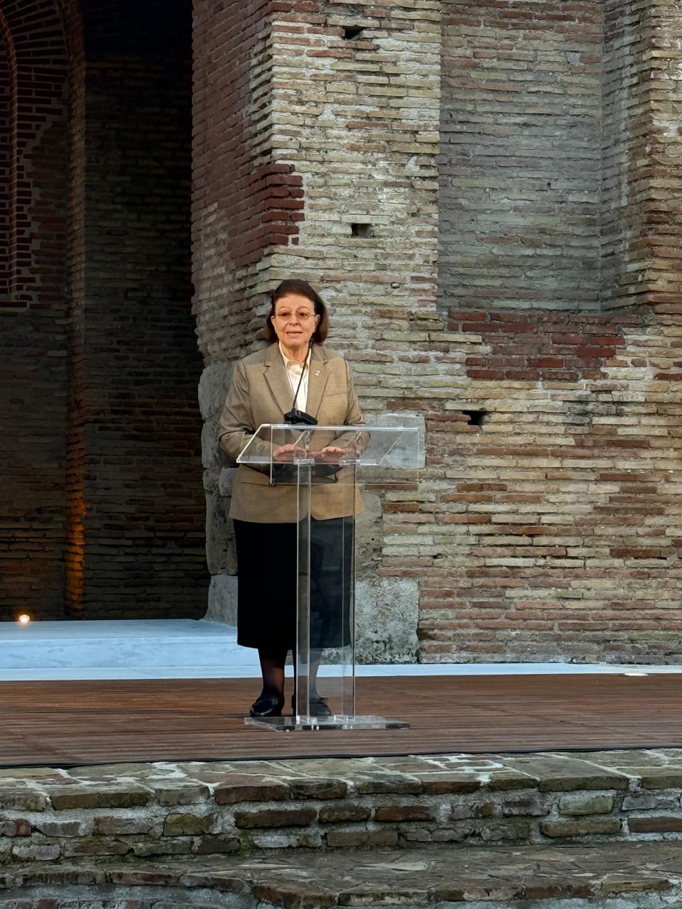 Ευχαριστώ, ιδιαίτερα την Εφορεία Αρχαιοτήτων Αχαΐας. Ήταν ένα έργο το οποίο, υπό άλλες συνθήκες, θα έπρεπε να το έχει αναλάβει η οικεία Διεύθυνση Αναστήλωσης Αρχαίων Μνημείων, του Υπουργείου. Όμως, η Εφορεία ανέλαβε το συγκεκριμένο έργο με αυτεπιστασία. Το προσωπικό της, βάζοντας εμπειρία, καταθέτοντας γνώση, κυρίως απόθεμα ψυχής, το έφερε, άριστα, εις πέρας. Θέλω, προσωπικά, να ευχαριστήσω την Αννίτα Κουμούση για τη συνεχή δράση της, όλα αυτά τα χρόνια που προΐσταται της Εφορείας Αρχαιοτήτων Αχαΐας. Θέλω να την ευχαριστήσω επειδή, με επιστημονική γνώση, με σοβαρότητα, με απόλυτη συνείδηση του τι σημαίνει δημόσιος λειτουργός, όλα αυτά τα χρόνια προσέφερε στην πατρίδα μας. Προσέφερε στην Πάτρα, στην Αχαΐα, σε όλους εσάς».