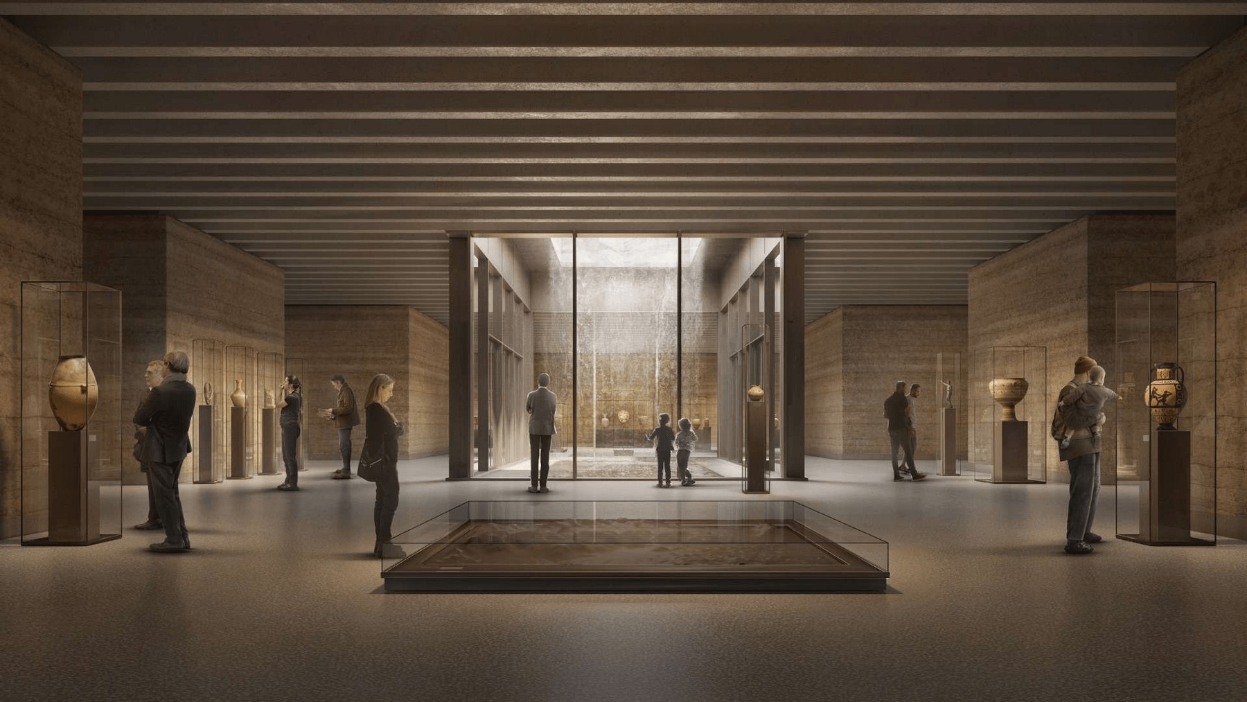 Η εγκεκριμένη κεντρική μουσειολογική ιδέα περιλαμβάνει μια πλήρη διαδρομή επισκεπτών, που σκιαγραφεί την εξέλιξη του ελληνικού πολιτισμού από τη Νεολιθική Εποχή έως την Ύστερη Αρχαιότητα. Η πλήρης ξενάγηση στην έκθεση καθοδηγεί τον επισκέπτη σε τέσσερα διαφορετικά κτηριακά επίπεδα, δύο στην επέκταση και δύο στο κτήριο-μνημείο. Για να προσφέρει στον επισκέπτη μια σαφή αφήγηση και προσανατολισμό, τόσο στην επέκταση όσο και στο μνημείο, εισάγεται ένας κεντρικός άξονας. Ο άξονας στο κάτω επίπεδο της επέκτασης οργανώνεται γύρω από ένα κεντρικό αίθριο, προσφέροντας φυσικό φως και προσανατολισμό, ενώ παράλληλα εκθέτει βασικά αντικείμενα που αντιπροσωπεύουν τις διαφορετικές εκθεσιακές εποχές. Στο κτήριο-μνημείο, η αλληλουχία των εκθεσιακών αιθουσών κατά μήκος του κεντρικού άξονα προσφέρει ποικίλες κλίμακες και συνθήκες φυσικού φωτισμού για να βελτιώσει την εμπειρία του επισκέπτη. Η εξέλιξη της ελληνικής γλυπτικής με την πάροδο του χρόνου παρουσιάζεται από την αρχαϊκή έως την κλασική Εποχή, καθώς ο επισκέπτης μετακινείται από τη μία αίθουσα στην άλλη.