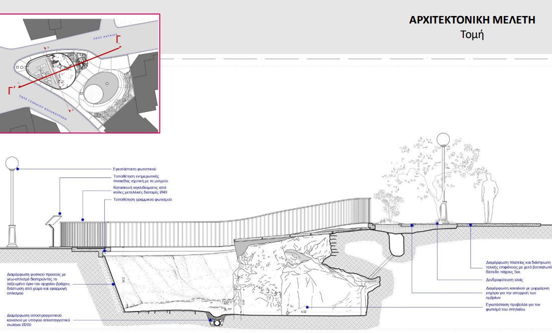 Προκειμένου να δρομολογηθούν οι εργασίες για τη συντήρηση, αποκατάσταση και ανάδειξη της αρχαίας Κρήνης και τη διαμόρφωση του περιβάλλοντος χώρου της, ώστε να καταστεί επισκέψιμη κρίθηκε απαραίτητη η εκπόνηση σειράς μελετών όπως: Γεωτεχνική-υδρολογική, μελέτη συντήρησης του δομικών υλικών και ηλεκτρολογική μελέτη για τον φωτισμό του μνημείου. Το έργο αφορά στη δομική αποκατάσταση και στερέωση του σπηλαίου. Ως προς τα αρχιτεκτονικά μέλη, στο μαρμάρινο στηθαίο και στην πλακόστρωση της αυλής, προβλέπονται ήπιες επεμβάσεις, συμπληρώσεις, καθαρισμοί, συντήρηση και διαμόρφωση φυσικού καναλιού με υπόγειο αποστραγγιστικό σωλήνα, που να συνδέεται με το δημόσιο δίκτυο αποχέτευσης. Προβλέπεται, επίσης, η αποκατάσταση του περιβάλλοντος χώρου στη συμβολή των οδών Γενναίου Κολοκοτρώνη και Ανταίου, όπως η αναδιαμόρφωση του ανεσκαμμένου χώρου, με δημιουργία αναλημμάτων, περιμετρικής πορείας και πρόσθετων υποδομών καθώς και ο φωτισμός του χώρου καθώς παρεμβάσεις που θα συμβάλουν στην κατανόηση και ανάδειξη του μνημείου. Το έργο περιλαμβάνει την διαμόρφωση νέας πλατείας, στην οποία θα ενσωματώνεται ο αρχαιολογικός χώρος, με την αξιοποίηση του όμορου οικοπέδου, ώστε να εξασφαλίζεται ένας ευχάριστος, λειτουργικός και ποιοτικός δημόσιος χώρος περιπάτου και πρασίνου για τη γειτονιά και τον επισκέπτη.