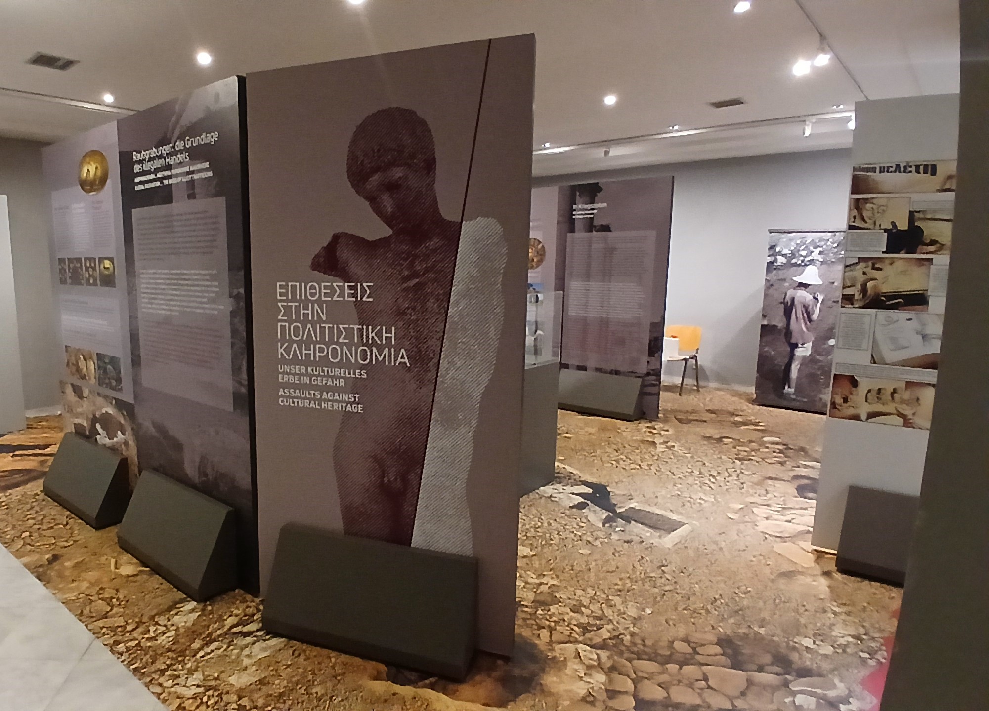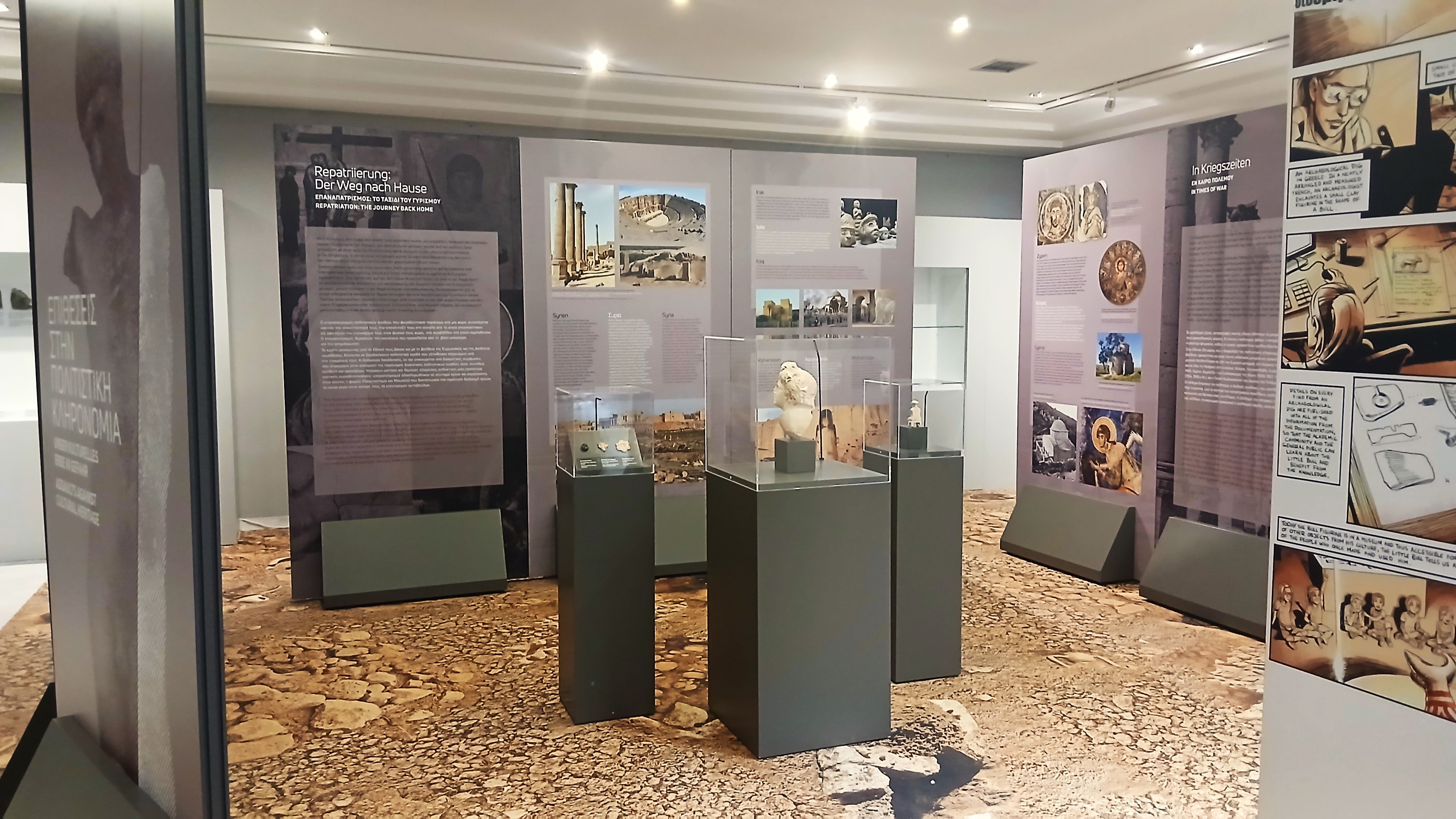 Κατά την εκθεσιακή διαδρομή, υπογραμμίζονται οι απειλές για την πολιτιστική κληρονομιά – λαθρανασκαφές, κλοπές, παράνομο εμπόριο, λεηλασίες κατά τις πολεμικές συγκρούσεις – και οι δυσμενείς επιπτώσεις τους: αφανισμός ή αλλοίωση του ιστορικού παρελθόντος, των τεκμηρίων, των ταυτοτήτων, της συλλογικής μνήμης.