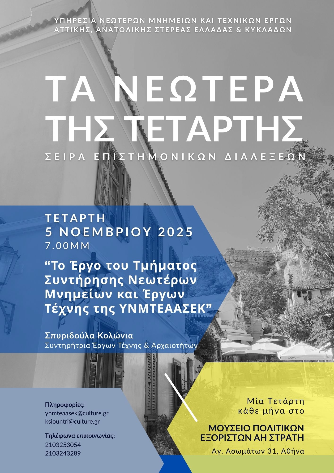 Η Υπηρεσία Νεωτέρων Μνημείων και Τεχνικών Έργων Αττικής, Ανατολικής Στερεάς Ελλάδας και Κυκλάδων, στο πλαίσιο της αποστολής της για την προστασία και ανάδειξη της νεώτερης πολιτιστικής κληρονομιάς σχεδίασε και διοργανώνει μία σειρά επιστημονικών και ενημερωτικών διαλέξεων με τίτλο, «Τα Νεώτερα της Τετάρτης».