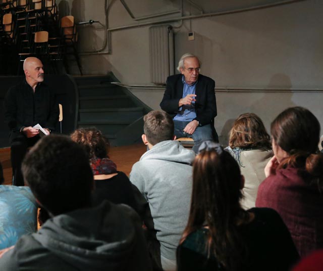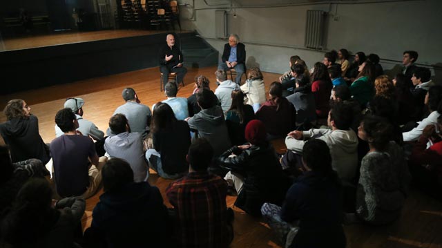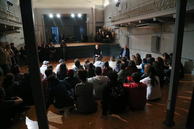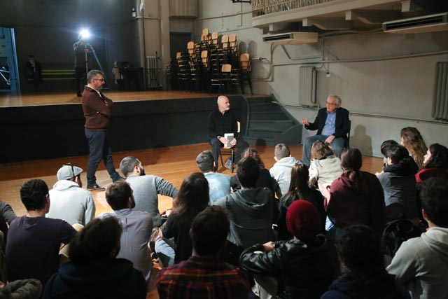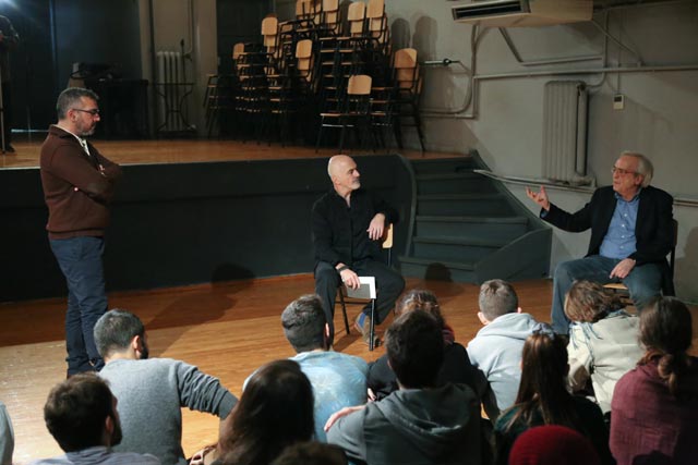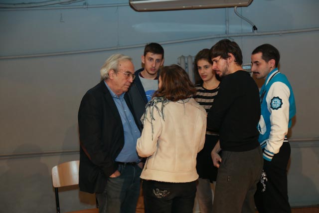 Στη συνέχεια, ο Υπουργός συνάντησε σπουδαστές και από τα τρία έτη φοίτησης, στη μεγάλη αίθουσα της σχολής, στο «Θεατράκι», όπως την ονομάζουν. Ο κ. Στάθης Λιβαθινός τόνισε την εκπαιδευτική-ακαδημαϊκή ιδιότητα του Υπουργού λέγοντας ότι «πρόκειται για έναν Δάσκαλο που είναι και Υπουργός και μας τιμά με την παρουσία του», ενώ ο κ. Μπαλτάς ρώτησε τους σπουδαστές για διάφορες πρακτικές παραμέτρους της σχολής, για τους λόγους που επέλεξαν να ακολουθήσουν αυτή τη σταδιοδρομία, για το «τι σημαίνει εντέλει υποκριτική», για το αν ισχύει η εντύπωση που έχει ότι «παρά την οικονομική κρίση ή και λόγω αυτής, συντελείται μια πολιτιστική άνθηση».