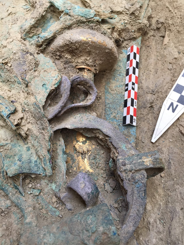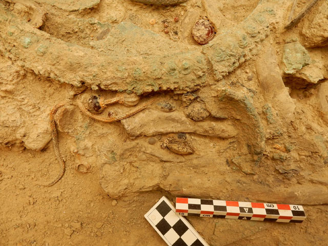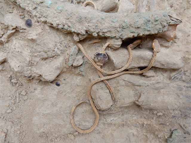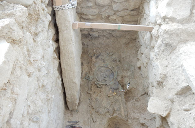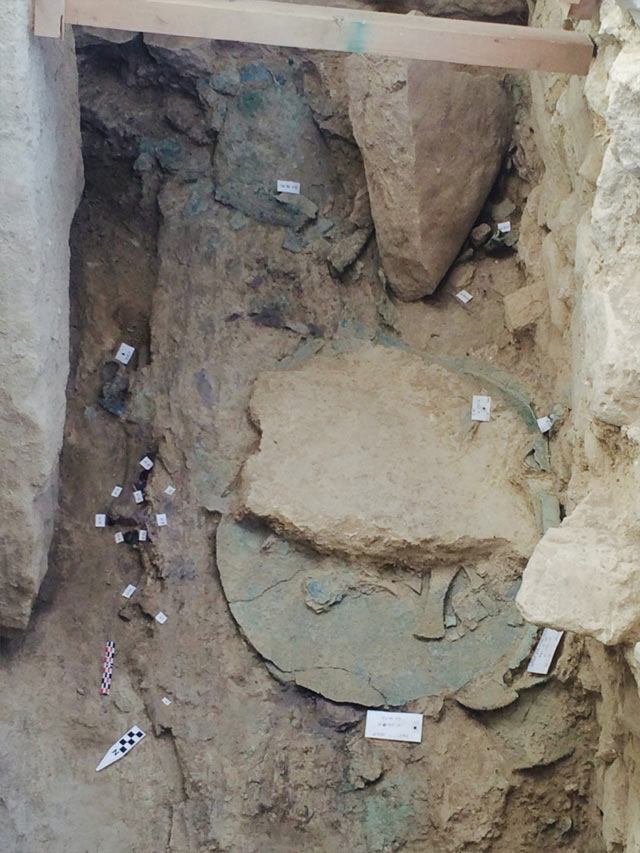 Χάλκινα: Επίμηκες ξίφος με ελεφαντοστέινη λαβή, επικαλυμμένη με χρυσό -σπάνια τεχνική που μιμείται την κεντητική- ήταν τοποθετημένο στο αριστερό στήθος του πολεμιστή. Ακριβώς από κάτω, βρέθηκε εγχειρίδιο με χρυσή λαβή παρόμοιας τεχνικής. Στα πόδια του νεκρού, βρέθηκαν χάλκινα όπλα, επίσης, χάλκινα αγγεία και κύπελλα, αμφορέας, πρόχοι και μία λεκανίδα.