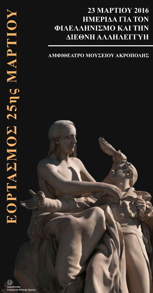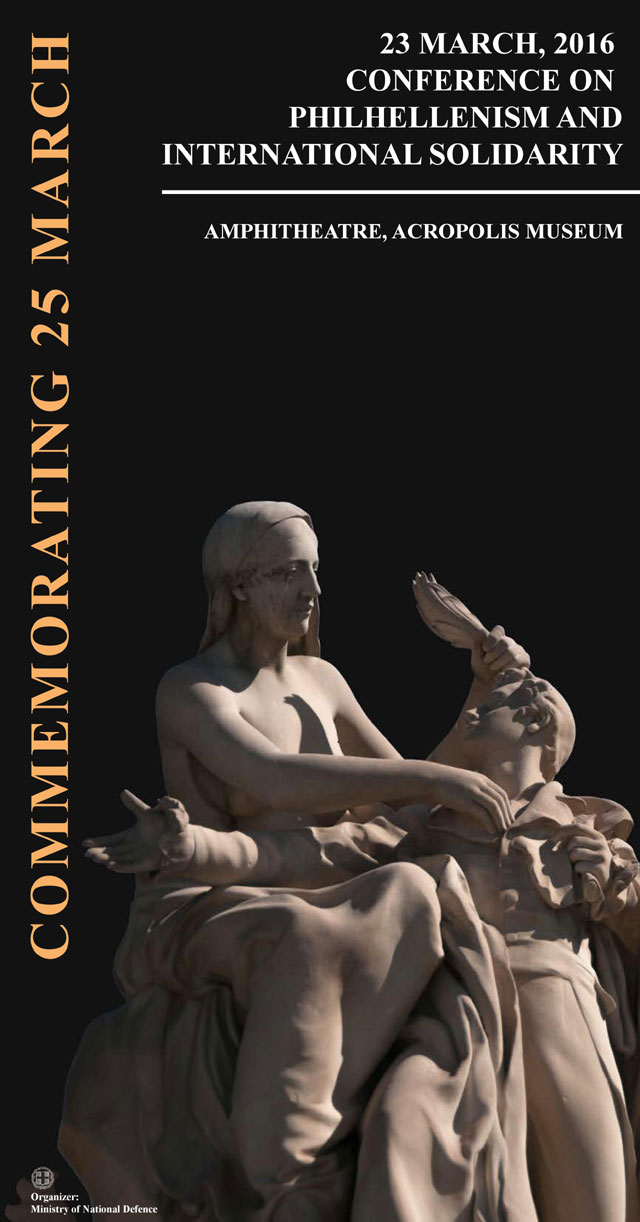To Υπουργείο Εθνικής Άμυνας, με την ευκαιρία της Εθνικής Εορτής της 25ης Μαρτίου, διοργανώνει Εκδήλωση-Ημερίδα με θέμα «Φιλελληνισμός, μια Ιδέα αφορμή για διεθνή αλληλεγγύη τότε… και τώρα;». Θα πραγματοποιηθεί την Τετάρτη 23 Μαρτίου 2016, στο αμφιθέατρο του Μουσείου Ακρόπολης, από 09:00 έως 13:30.
