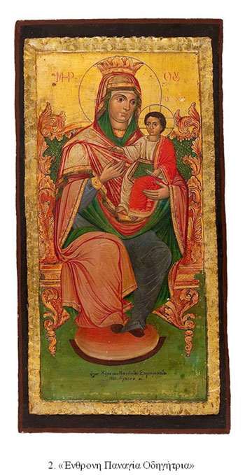 - «Ένθρονη Παναγία Οδηγήτρια», 1885, διαστ. 0,73Χ0,35μ., επίσης κλαπείσα από την μονή Γενεσίου της Θεοτόκου και Αγίου Χαραλάμπους, στη θέση Αργυραίϊκα Πετρίλου Καρδίτσας,