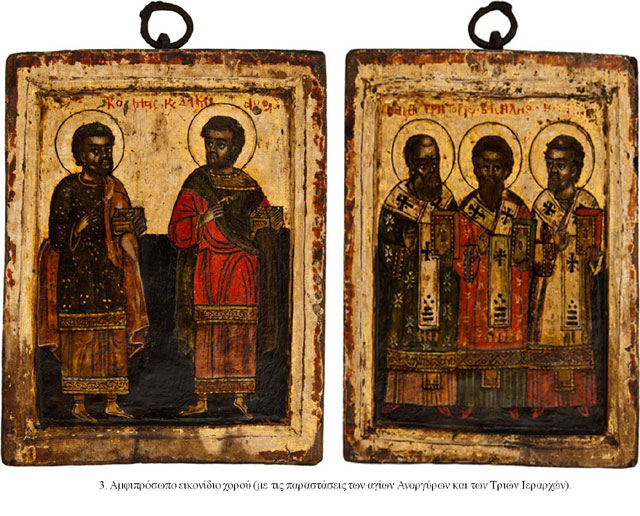 - Αμφιπρόσωπο εικονίδιο χορού (με τις παραστάσεις των Αγίων Αναργύρων και των Τριών Ιεραρχών), 18ου αι., διαστ. 0,17Χ0,12μ., που είχε κλαπεί από το ναό Κοίμησης Θεοτόκου Κουκουλίου, Π.Ε. Ιωαννίνων, Περιφέρειας Ηπείρου. Η κλοπή πραγματοποιήθηκε το διάστημα 21–25.12.2009.