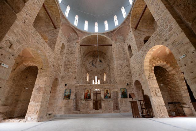 Στον κυρίως ναό και στο επισκοπείο πραγματοποιήθηκαν εκτεταμένες στερεωτικές εργασίες με τοπικές ανακτήσεις λιθοδομών, εκτέλεση αρμολογημάτων και εφαρμογή ενεμάτων. Δόθηκε μεγάλη έμφαση στη διατήρηση των αυθεντικών αρμολογημάτων του ναού, στα οποία διακρίνονται τρεις τουλάχιστον διαφορετικές φάσεις. Στον τεράστιο τρούλο που ανέκτησε ο Στίκας κατασκευάστηκαν μεταλλικά κελύφη, τα οποία, σε συνδυασμό με μία σειρά ελκυστήρων και αγκυρίων τιτανίου, παρέλαβαν το βάρος του ημισφαιρικού θόλου αποφορτίζοντας την υποκείμενη αρχική τοιχοποιία. Το δάπεδο επιστρώθηκε με μαρμάρινες πλάκες, ενώ στη θέση τους παρέμειναν τα ελάχιστα δείγματα από την αρχική πλακόστρωση. Το ιερό βήμα καλύφθηκε με πήλινα πλακίδια. Κατά το πρώτο στάδιο του έργου εκτελέστηκαν, τόσο στο επισκοπείο όσο και στον κυρίως ναό, εκτεταμένες διερευνητικές εργασίες, κατά τις οποίες αποκαλύφθηκαν πολύτιμα στοιχεία για την πληρέστερη κατανόηση της οικοδομικής ιστορίας του ναού, ενώ στον χώρο του νάρθηκα εντοπίστηκαν δεκάδες αλλεπάλληλες ταφές του 13ου και 14ου αιώνα.