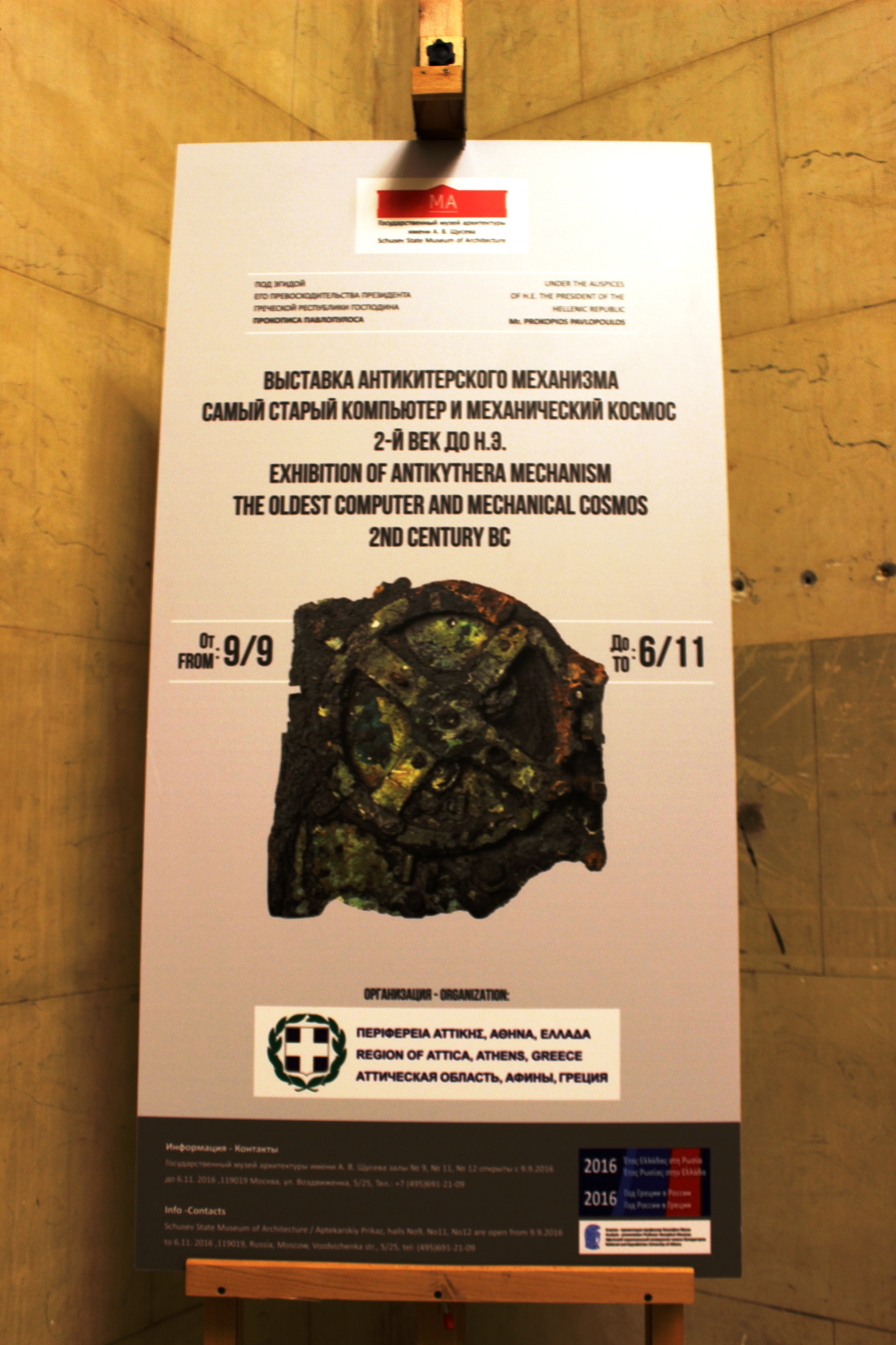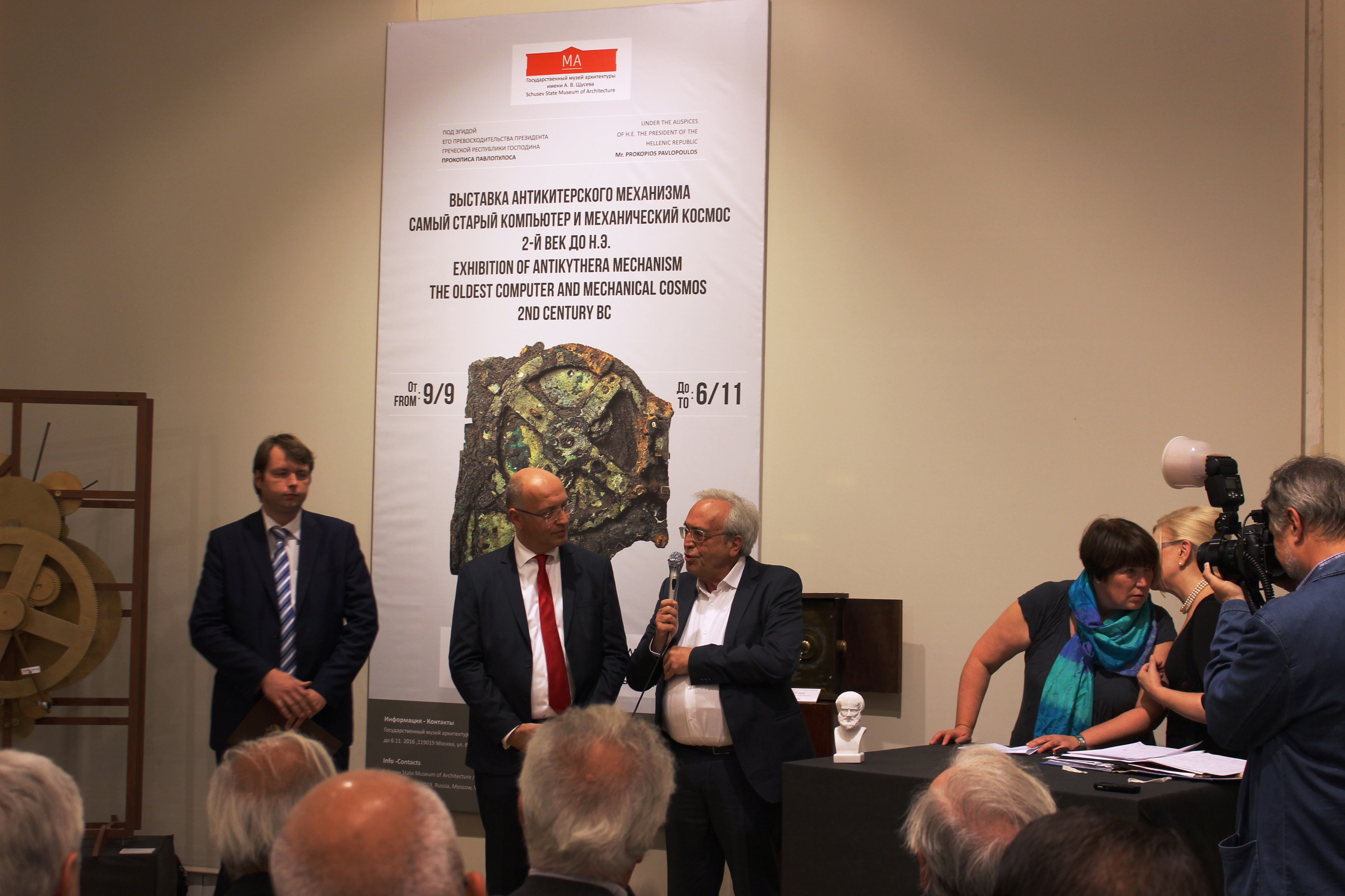 Τα εγκαίνια της έκθεσης «Μηχανισμός Αντικυθήρων: Ο αρχαιότερος Υπολογιστής και το αρχαιότερο Μηχανικό Σύμπαν-2ος αιώνας π.Χ.» πραγματοποιήθηκαν χθες το βράδυ, 8 Σεπτεμβρίου, με την παρουσία του Υπουργού Πολιτισμού και Αθλητισμού κ. Α. Μπαλτά στο Κρατικό Μουσείο Αρχιτεκτονικής Α.Β. Σούσεφ στη Μόσχα. Την έναρξη της έκθεσης, που τελεί υπό την αιγίδα της Α.Ε του Προέδρου της Δημοκρατίας, κ. Προκόπη Παυλόπουλου και διοργανώνεται από την Περιφέρεια Αττικής στο πλαίσιο του έτους Ελλάδας Ρωσίας, κήρυξε η Περιφερειάρχης Αττικής, κ. Ρ. Δούρου.
