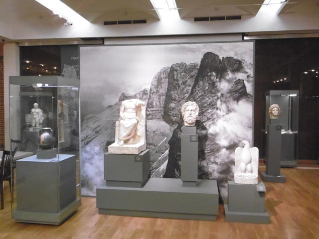 Μαρμάρινα γλυπτά, αγγεία, πήλινα ειδώλια, χάλκινα τέχνεργα, κοσμήματα, νομίσματα κ.α. που χρονολογούνται από τους προϊστορικούς έως τους ρωμαϊκούς χρόνους, από 25 Αρχαιολογικά Μουσεία της Ελλάδας, καθώς και πλούσιο εποπτικό και οπτικοακουστικό υλικό μεταφέρουν την εμπειρία του θείου στοιχείου κατά την αρχαιότητα, όπως αποτυπώνεται από την απεικόνιση των ανθρωπόμορφων θεών του Ολύμπου. Ανάμεσα τους ξεχωρίζουν αριστουργήματα της αρχαίας ελληνικής τέχνης, όπως το μαρμάρινο ανάγλυφο αυστηρού ρυθμού της «Σκεπτομένης Αθηνάς» από το Μουσείο Ακρόπολης, η περίφημη πελίκη του «Ζωγράφου του Προνόμου» με την παράσταση του θεού Άρη και Γιγάντων, από το Εθνικό Αρχαιολογικό Μουσείο, το χάλκινο μετάλλιο με την προτομή της Αθηνάς Προμάχου από το Αρχαιολογικό Μουσείο Θεσσαλονίκης, ο μαρμάρινος Απόλλων, αντίγραφο Φειδιακού τύπου, από το Διαχρονικό Μουσείο Λάρισας, ο ένθρονος Δίας από το Αρχαιολογικό Μουσείο Δίου, το άγαλμα του νεαρού Διονύσου, που θυμίζει το Λύκειο Απόλλωνα του Πραξιτέλη, από το Αρχαιολογικό Μουσείο Θεσσαλονίκης.