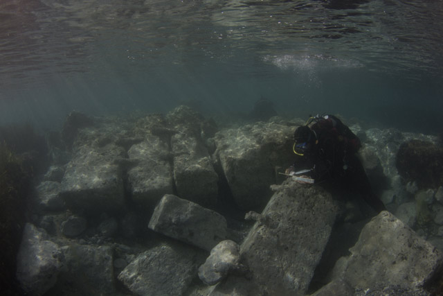 Εικ. 2 Αρχαιολόγος σχεδιάζει μετατοπισμένο δόμο στην περιοχή του διαύλου εισόδου. Ο δόμος φέρει ακέραιους τους μεταλλικούς συνδέσμους (Φωτ: Β. Τσιαΐρης, 2016)