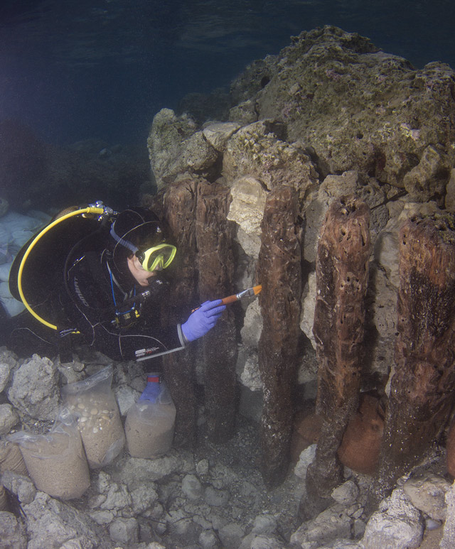 Εικ. 1 In situ καθαρισμός και συντήρηση των ξύλινων δοκών του μόλου (Φωτ: Β. Τσιαΐρης, 2016)