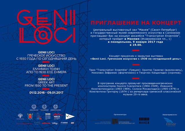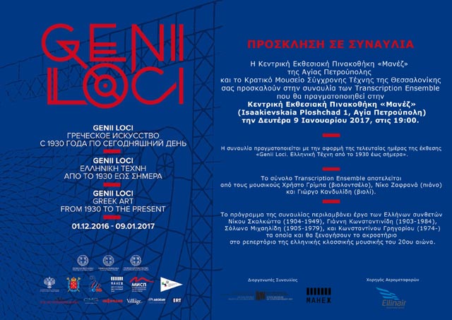 Το έργο Ελλήνων συνθετών του 20ου αιώνα θα έχουν την ευκαιρία να γνωρίσουν οι φιλότεχνοι της Αγίας Πετρούπολης από το μουσικό σύνολο 'Transcription Ensemble' στο Κρατικό Μουσείο Manege, τη Δευτέρα 9 Ιανουάριου 2017, στις 19:00, τελευταία ημέρα της έκθεσης «Genii Loci. Ελληνική Τέχνη από το 1930 έως σήμερα». Το σύνολο 'Transcription Ensemble' αποτελείται από τους μουσικούς Χρήστο Γρίμπα (βιολοντσέλο), Νίκο Ζαφρανά (πιάνο) και Γιώργο Κανδυλίδη (βιολί). Η συναυλία θα πραγματοποιηθεί μετά από σχετική πρόταση του Κρατικού Μουσείου Σύγχρονης Τέχνης προς το Ρωσικό μουσείο, στο πλαίσιο της εξαιρετικής συνεργασίας τους.