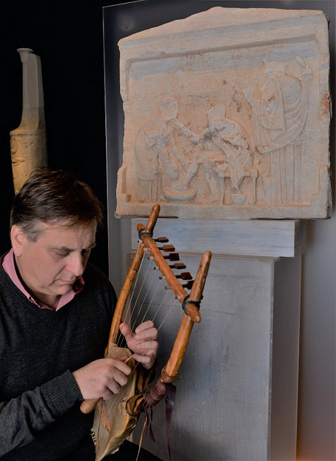 Εικ. 1. Ο μουσικοσυνθέτης Δρ Ν. Ξανθούλης με ανακατασκευασμένη αρχαία λύρα, μπροστά στο αναθηματικό ανάγλυφο που φέρει παράσταση της σκηνής αναγνώρισης του Οδυσσέα από τη γριά τροφό του Ευρύκλεια. Στη δεξιά πλευρά, μπροστά σε όρθιο αργαλειό, η Πηνελόπη (4ος αι. π.Χ., από το Μουζάκι Καρδίτσας).
