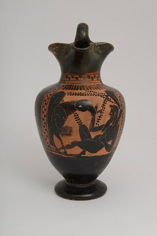 Εικ. 2. Αττική τριφυλλόστομη οινοχόη που ιστορεί το επεισόδιο της διαφυγής του Οδυσσέα από τη σπηλιά του Κύκλωπα. Γύρω στο 490 π.Χ. (© TAΠΑ/Εθνικό Αρχαιολογικό Μουσείο)