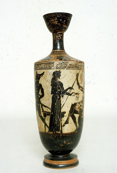 Εικ. 3. Αττική μελανόμορφη λήκυθος με τη μάγισσα Κίρκη να έχει ήδη μεταμορφώσει τους συντρόφους του Οδυσσέα σε χοίρους και να ετοιμάζεται να δώσει το μαγικό της φίλτρο στον πολυμήχανο ήρωα. 490-480 π.Χ. (© TAΠΑ/Εθνικό Αρχαιολογικό Μουσείο)