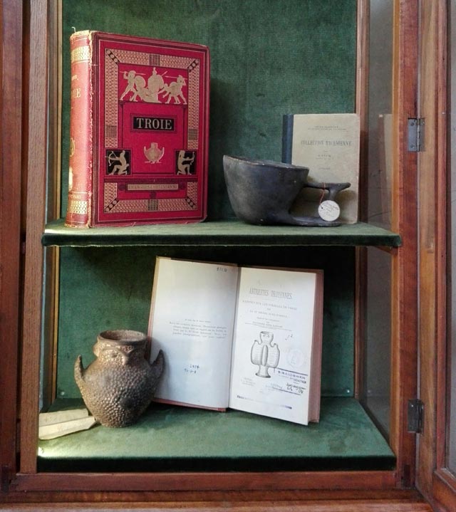 Εικ.5: Ο πολυτελής τόμος του Ερρίκου Σλήμαν για τις ανασκαφές της Τροίας, άλλες εκδόσεις και αντίγραφα αρχαιοτήτων του 19ου αι., σε μία από τις προθήκες που σχεδιάστηκαν για την πρώτη έκθεση των Προϊστορικών Αρχαιοτήτων του Μουσείου.