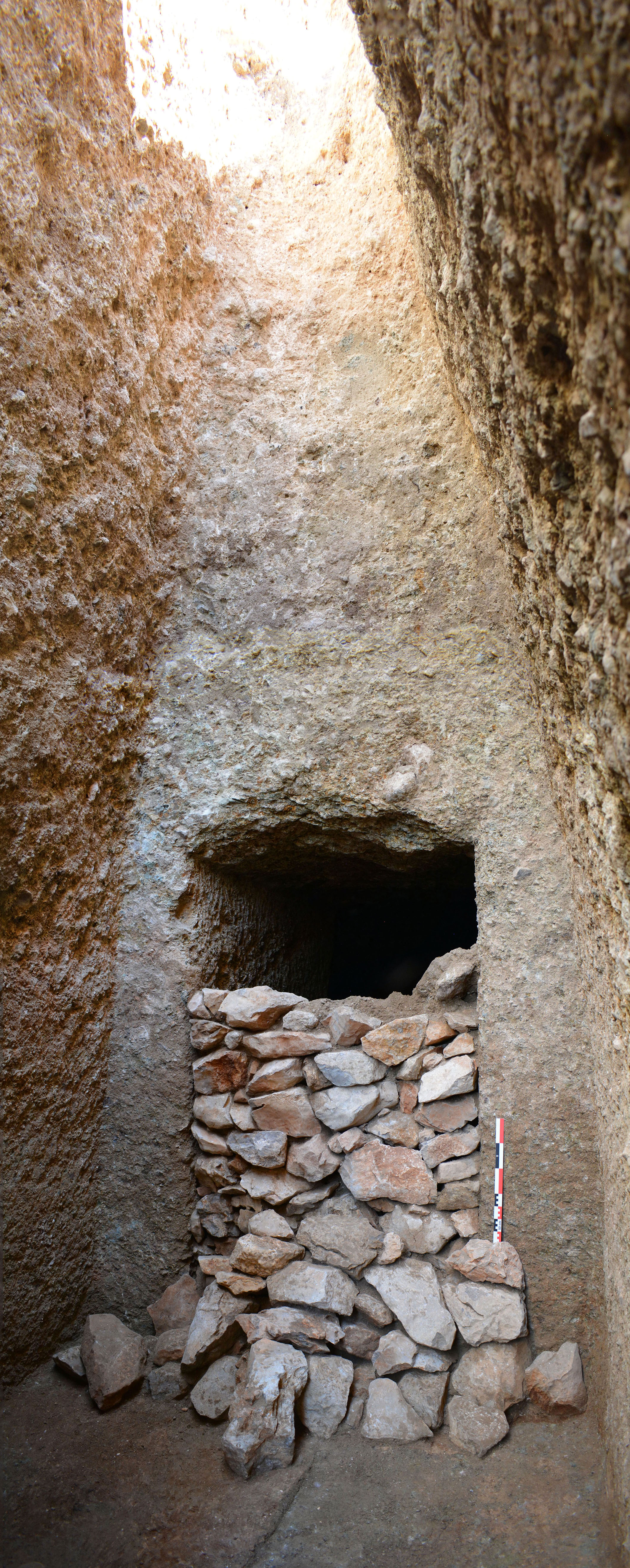 1: Θαλαμοειδής τάφος Προσηλίου. Άποψη της πρόσοψης του μνημειακού τάφου και της ξερολιθιάς που έφραζε την είσοδο. Φωτογραφία: Γιάννης Γαλανάκης