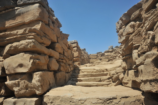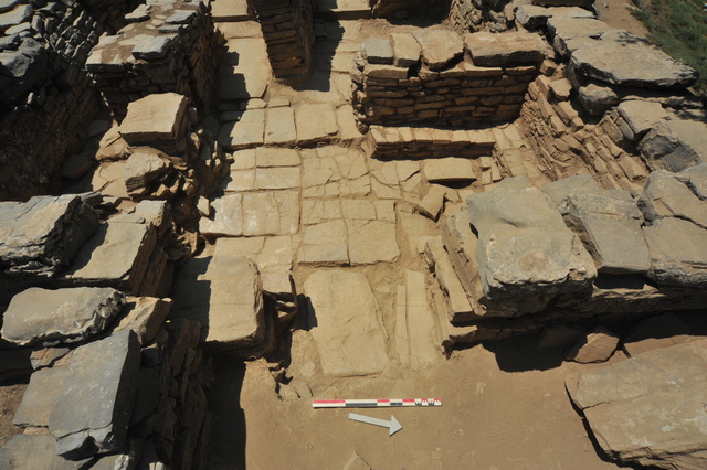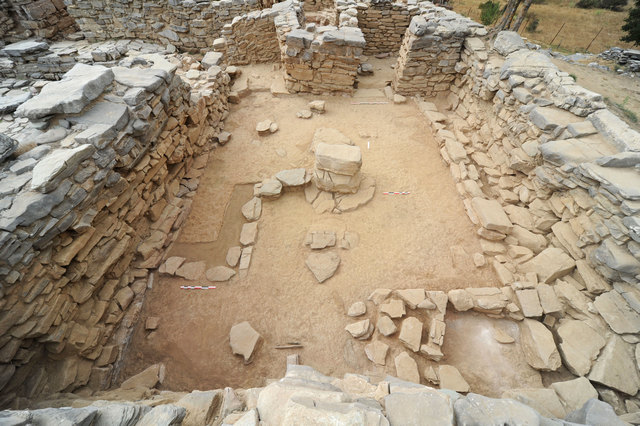 Μία ακόμη εσωτερική σκάλα αποκαλύφθηκε κατά την ανασκαφή (φωτ.4) ενώ οι τοίχοι, μερικοί από τους οποίους σώζονται σε ύψος έως και τριών μέτρων αποδεικνύουν, ότι το κτήριο ήταν πολυώροφο. Οι μεγάλες του αίθουσες στήριζαν τους επάνω ορόφους με κεντρικούς πεσσούς ή κίονες(Φωτ 5.). Τα δάπεδα, που ήρθαν και φέτος στο φως, άλλα από λαμπερό ασβεστόλιθο κι άλλα βοτσαλωτά υποδηλώνουν την πολυτέλεια που επικρατούσε στο εσωτερικό του, το ίδιο και τα τοιχογραφημένα κονιάματα που κοσμούσαν τα δωμάτια, δείγμα εκλέπτυνσης της εποχής και των κατοίκων του.