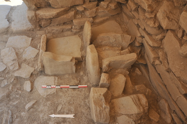 Σε διπλανό δωμάτιο οι λίθινες θήκες (Φωτ.7) που αποκαλύφθηκαν θα περιείχαν πολύτιμα αντικείμενα, τα οποία ασφαλώς πήραν μαζί τους οι ένοικοι αφήνοντας πίσω τους ελάχιστα λείψανα, όπως έναν μικρό χάλκινο σκαραβαίο, τοπική μίμηση των αιγυπτιακών, μία σφραγίδα και πολλά θαλάσσια όστρεα μη βρώσιμα, που δείχνουν ότι στην περιοχή λατρευόταν θεότητα στην θαλάσσια εκδοχή της, όπως γνωρίζουμε και από την Κνωσό. Πλήθος αγγείων εξάλλου βρέθηκε σε αποθέτη του ίδιου δωματίου.