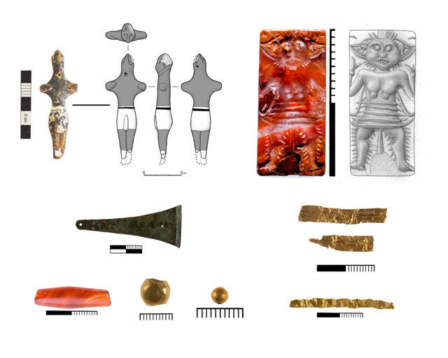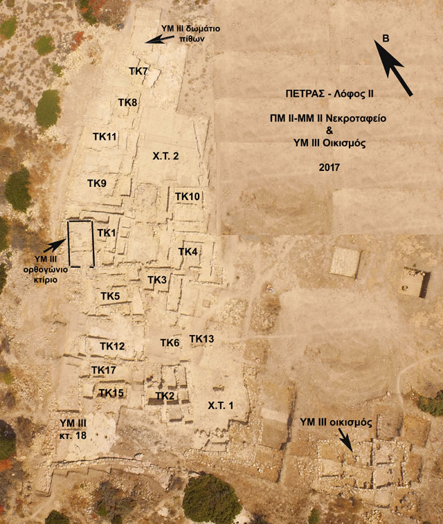 H ανασκαφή του ασύλητου Προ- και Παλαιο-ανακτορικού μινωικού νεκροταφείου Πετρά Σητείας (2800-1800 π.Χ) συνεχίσθηκε για 12ηχρονιά, υπό τη διεύθυνση της επίτιμης Διευθύντριας του ΥΠΠΟΑ, Δρ Μεταξίας Τσιποπούλου, με εξαιρετικά αποτελέσματα. Ο Πετράς ανασκάπτεται και μελετάται από διεπιστημονική ομάδα 26 ατόμων από 9 χώρες. Στο νεκροταφείο έχουν μέχρι σήμερα ανασκαφεί 17 μεγάλα ταφικά κτίρια (με εμβαδόν έως 125 τετρ.μ.) (Εικ. 1), μία ταφική βραχοσκεπή, τρεις λάκκοι και δύο εκτεταμένοι χώροι τελετουργιών (Εικ. 2), που ανεγέρθηκαν και χρησιμοποιήθηκαν από εξέχουσες οικογένειες του ανακτορικού οικισμού. Οι ταφές είναι δευτερογενείς, με επτά μόνον εξαιρέσεις πρωτογενών. Η ποσότητα και η διατήρηση του σκελετικού υλικού είναι μοναδική, καθώς και η ποικιλία των κτερισμάτων, πολλά από αυτά πολύτιμα κατασκευασμένα εισηγμένες πρώτες ύλες. Ενδεικτικά αναφέρονται μεγάλος αριθμός χρυσών και ασημένιων κοσμημάτων, πολλά χάλκινα εργαλεία, ιδίως καλλωπισμού, περισσότερα από 200 λίθινα αγγεία, περισσότερες από 65 σφραγίδες από ελεφαντόδοντο και ημιπολύτιμους λίθους, και δύο σφραγιστικά δακτυλίδια (Εικ. 3). Η ποσότητα της κεραμικής είναι επίσης σημαντικότατη και περιλαμβάνει πολύ μεγάλο αριθμό διακοσμημένων, ιδίως τελετουργικών αγγείων. Η φετινή χρονιά επικεντρώθηκε κυρίως σε ΠΜ ΙΙ και ΜΜ ΙΙ ταφικά σύνολα, από τα οποία προέκυψαν νέες ελεφάντινες σφραγίδες, μοναδικά χρυσά κοσμήματα, χάνδρες από χρυσό και ημιπολύτιμους λίθους, καθώς και λίθινα αγγεία και ειδώλια με πολύχρωμη καμαραϊκή διακόσμηση.