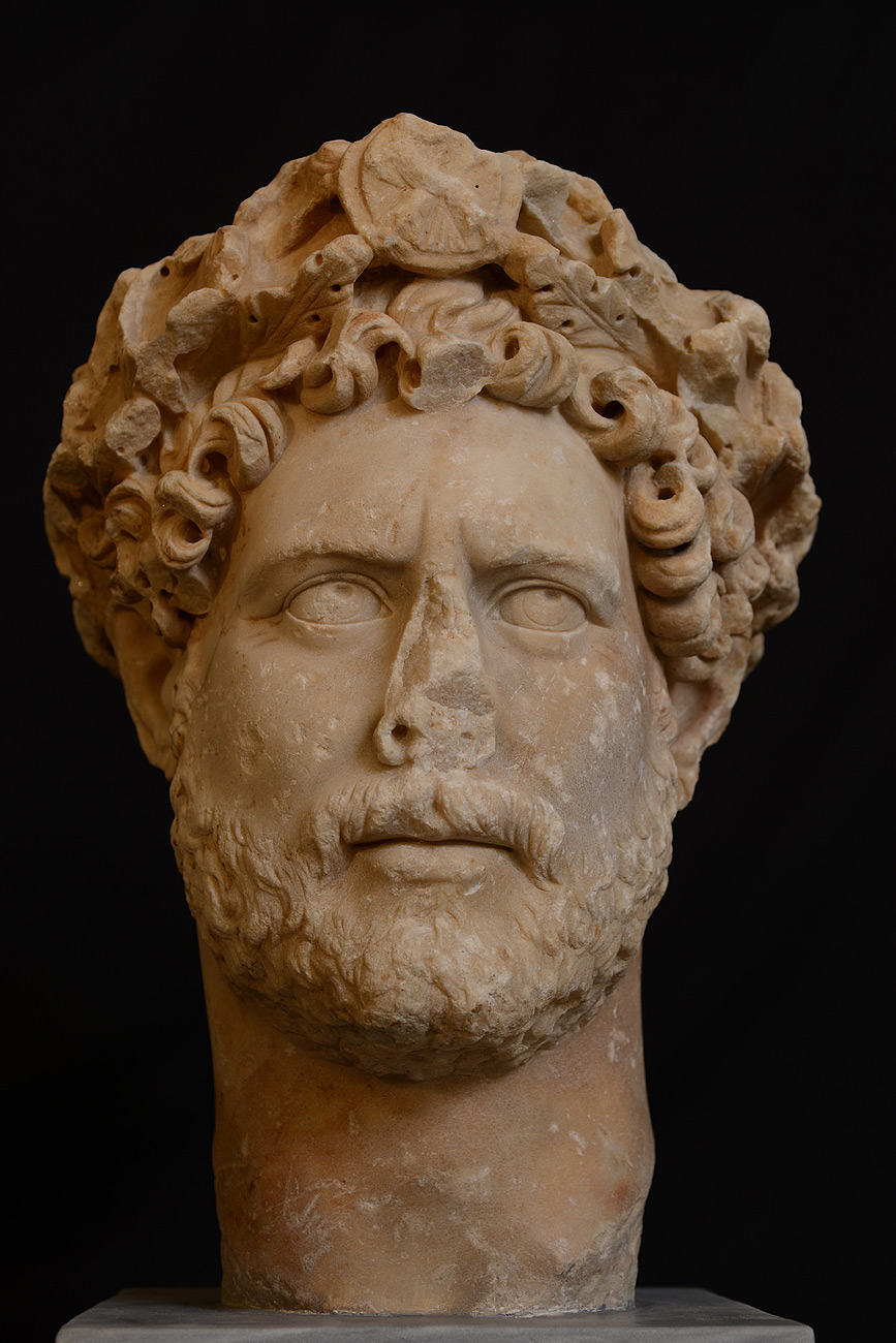 Εικ. 1. Εικονιστική μαρμάρινη κεφαλή του αυτοκράτορα Αδριανού (117-138 μ.Χ.).Βρέθηκε το 1933 στην Αθήνα, στη λεωφόρο Συγγρού. Χρονολογείται το 130-140 μ.Χ.