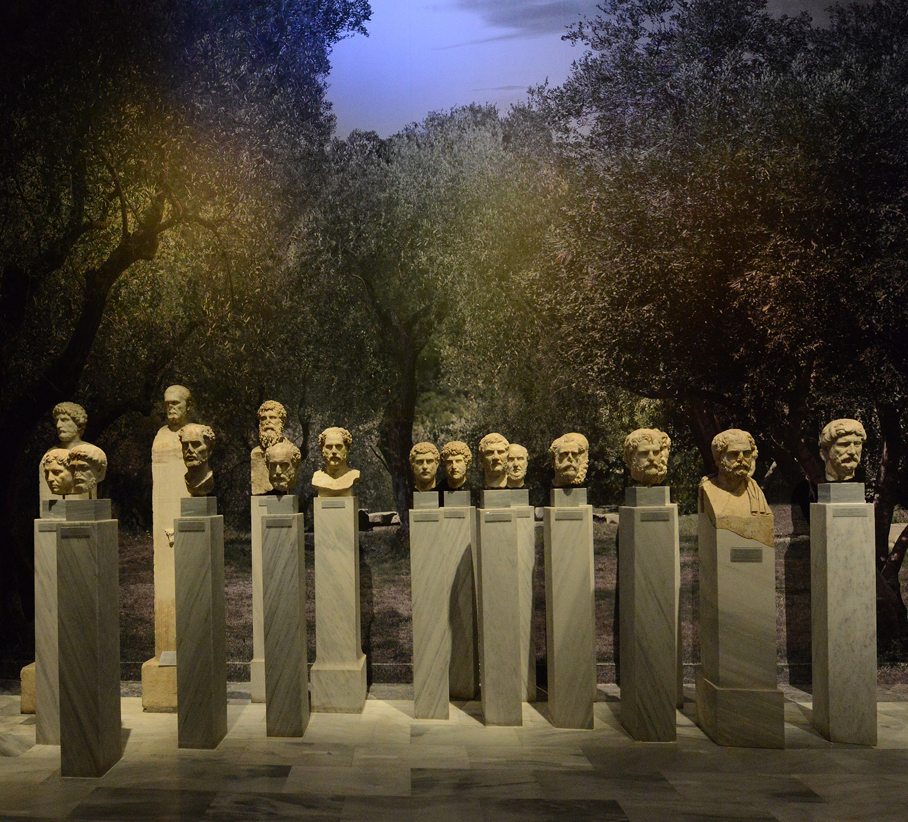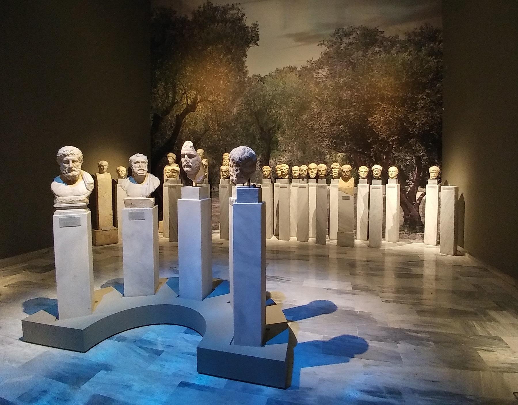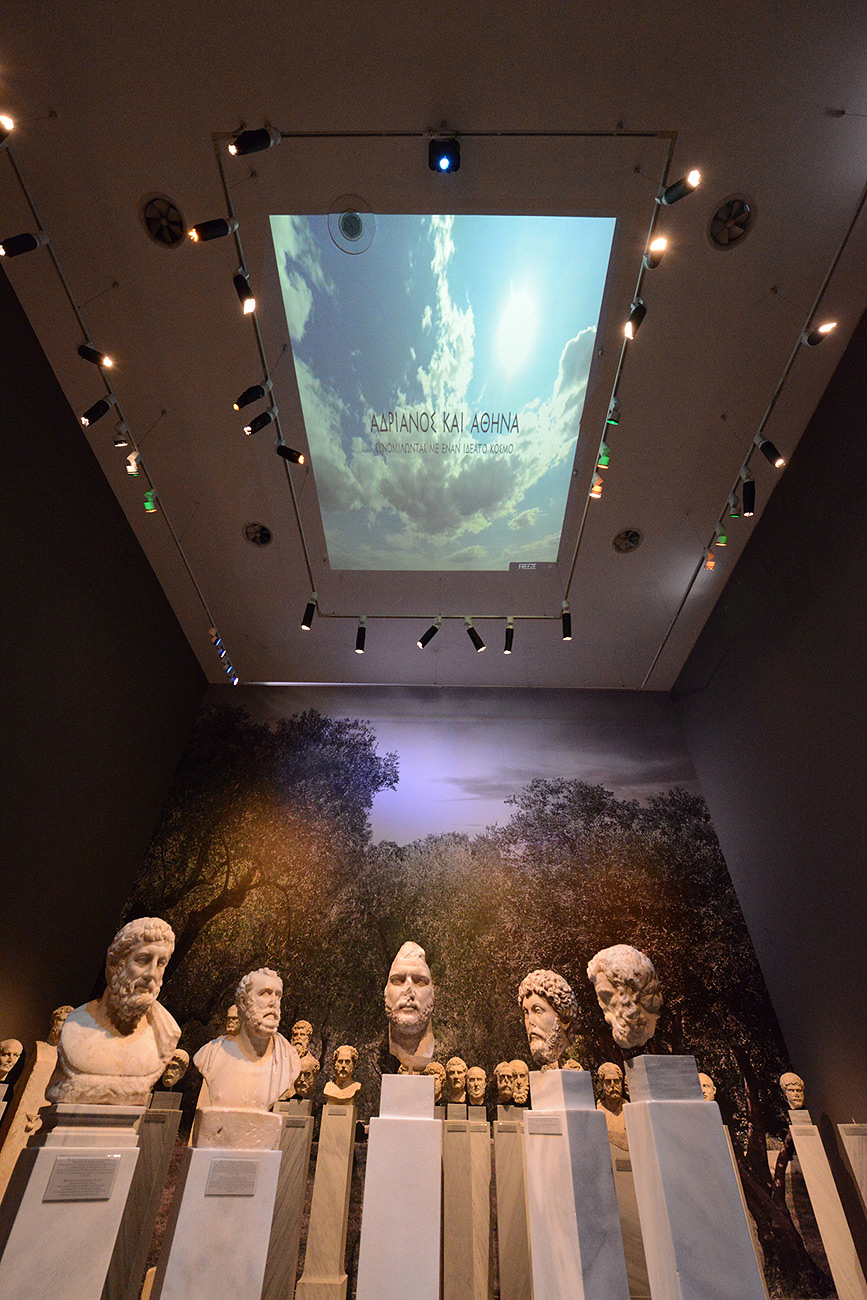 Η αίθουσα των Αθηναίων Κοσμητών στη μόνιμη έκθεση της Συλλογής Γλυπτών επιλέχθηκε ως το ιδανικό σκηνικό για την ανάπτυξη της μουσειολογικής ιδέας. Πορτραίτα του αυτοκράτορα Αδριανού τοποθετήθηκαν στο κέντρο της αίθουσας σε ένα νοερό φιλοσοφικό διάλογο για τον ελληνικό πολιτισμό με εμβληματικές μορφές διανοητών της αρχαιότητας, όπως ο Μητρόδωρος, ο Αντώνιος Πολέμων και ο Ηρώδης του Αττικού. Τη φανταστική συνομιλία παρακολουθούν τα πορτραίτα του Πλάτωνα και του Αριστοτέλη ως σύμβολα της ελληνικής φιλοσοφικής σκέψης και οι Κοσμητές, οι αξιωματούχοι που είχαν την ευθύνη της διανοητικής και σωματικής εκπαίδευσης των εφήβων στα αθηναϊκά γυμνάσια της αυτοκρατορικής περιόδου. Μέσα από το εμπλουτισμένο εκθεσιακό αφήγημα, οι θεματοφύλακες της παραδοσιακής ελληνικής παιδείας προσεγγίζονται με νέα ερμηνευτικά μέσα, που αναδεικνύουν τη βαθιά πνευματική συγγένεια του ελληνικού και του ρωμαϊκού πολιτισμού. Ο κόσμος των Γυμνασίων της Αθήνας ζωντανεύει επίσης με μια σειρά αντιπροσωπευτικών εκθεμάτων και την υπέροχη προτομή του Αντίνοου, του αγαπημένου συντρόφου του Αδριανού, που θεοποιήθηκε μετά τον πρόωρο θάνατό του και λατρευόταν στα Γυμνάσια ως πρότυπο νεανικής ομορφιάς και ρώμης.