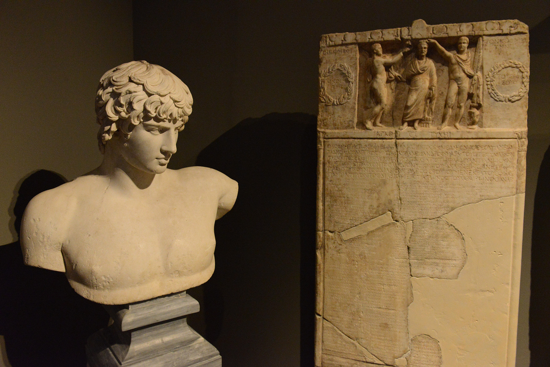 Εικ. 4. Εικονιστική προτομή του Αντίνοου, από την Πάτρα (130-138 μ.Χ.). Δίπλα της στήλη με κατάλογο των αξιωματούχων του Γυμνασίου και των εφήβων κατά φυλές. Από την Αθήνα. Γύρω στο 212/213 μ.Χ.