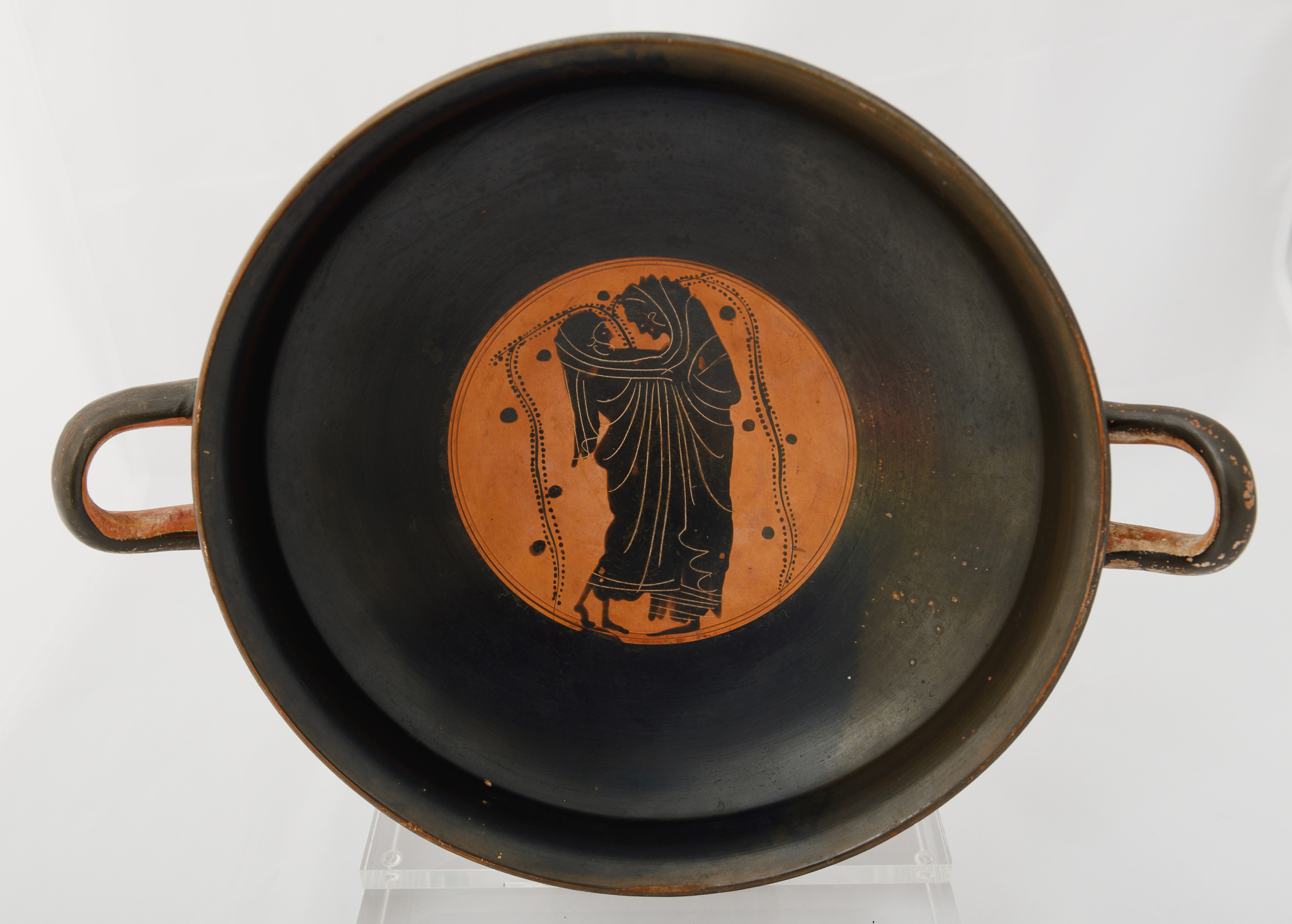 Εικ. 2. Μελανόμορφη κύλικα. Άγνωστης προέλευσης. 490-480 π.Χ. Στο μετάλλιο της κύλικας εικονίζεται ερωτικό ζευγάρι, τυλιγμένο στο ίδιο ιμάτιο. (© TAΠΑ/Εθνικό Αρχαιολογικό Μουσείο)