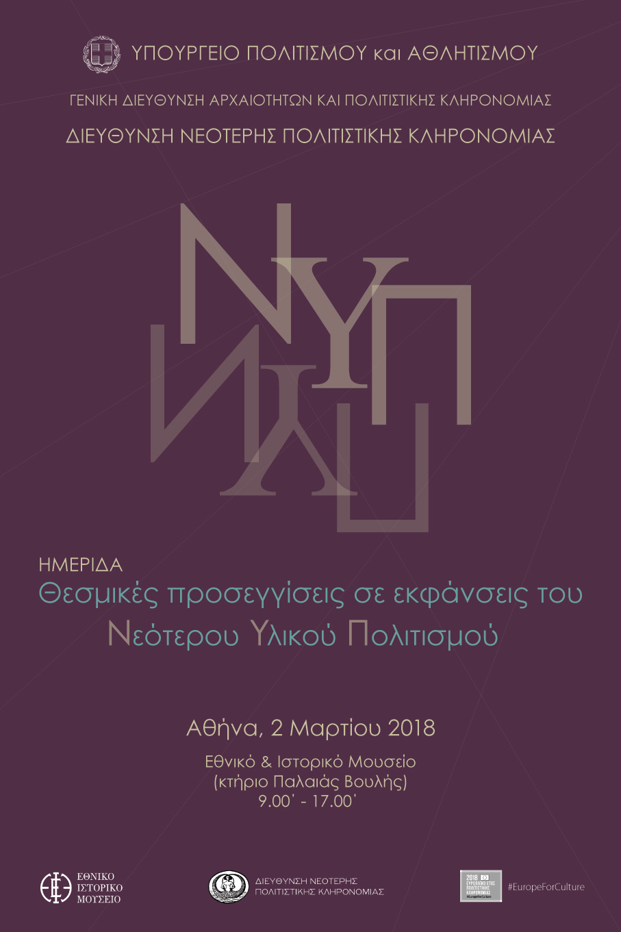 Η Διεύθυνση Νεότερης Πολιτιστικής Κληρονομιάς διοργανώνει ημερίδα με θέμα: «Θεσμικές Προσεγγίσεις σε εκφάνσεις του Νεότερου Υλικού Πολιτισμού», που θα πραγματοποιηθεί στις 2 Μαρτίου 2018, στο Εθνικό και Ιστορικό Μουσείο (κτήριο Παλαιάς Βουλής), από τις 9.00 έως τις 17.00.
