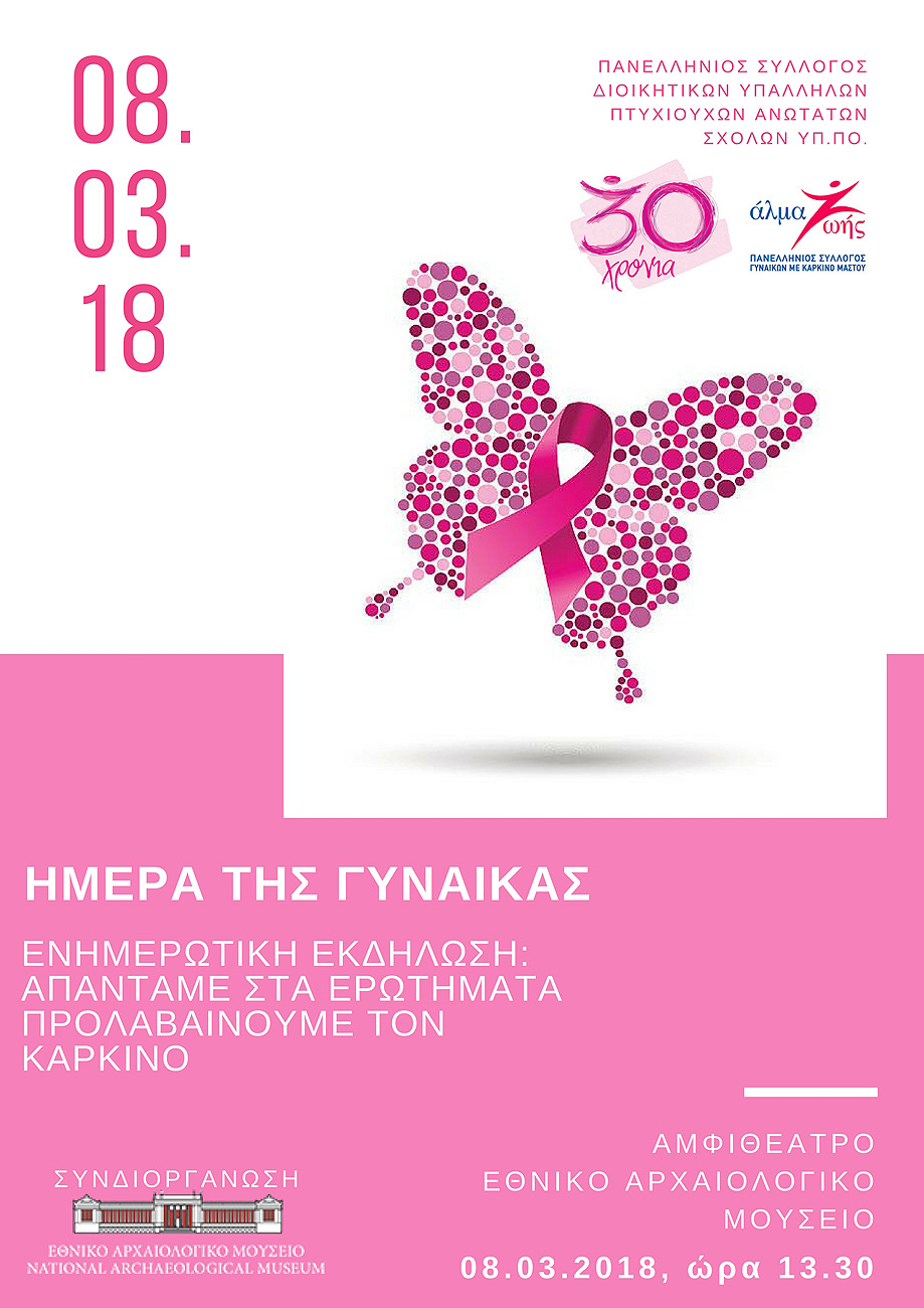 Στο πλαίσιο του εορτασμού της Παγκόσμιας Ημέρας της Γυναίκας, την Πέμπτη 8 Μαρτίου και ώρα 13:30, διοργανώνεται ενημερωτική εκδήλωση για την πρόληψη του καρκίνου του μαστού στο Αμφιθέατρο του Εθνικού Αρχαιολογικού Μουσείου. Την εκδήλωση συνδιοργανώνουν ο Πανελλήνιος Σύλλογος Διοικητικών Υπαλλήλων Πτυχιούχων Ανωτάτων Σχολών του ΥΠ.ΠΟ.Α και το Εθνικό Αρχαιολογικό Μουσείο με τη συνεργασία του Πανελλήνιου Συλλόγου Γυναικών με Καρκίνο Μαστού «ΑΛΜΑ ΖΩΗΣ».