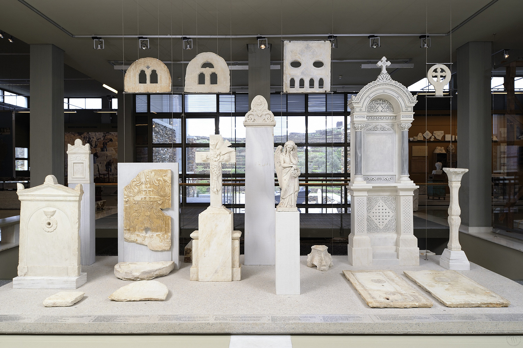 Ξεχωριστή θέση στην έκθεση της Τήνου καταλαμβάνει η ενότητα με τα κυκλαδικά ειδώλια, που αποτέλεσαν πηγή έμπνευσης για σπουδαίους σύγχρονους καλλιτέχνες. Στην πλειονότητά τους απεικονίζουν γυμνές γυναικείες μορφές με διπλωμένα χέρια και ελαφρώς λυγισμένα γόνατα. Ο επισκέπτης θα έχει τη δυνατότητα να θαυμάσει το μεγάλου μεγέθους ειδώλιο εγκυμονούσας γυναίκας αλλά και ένα βιολόσχημο, που συνιστά προγενέστερο τύπο των κυκλαδικών ειδωλίων με διπλωμένα χέρια.