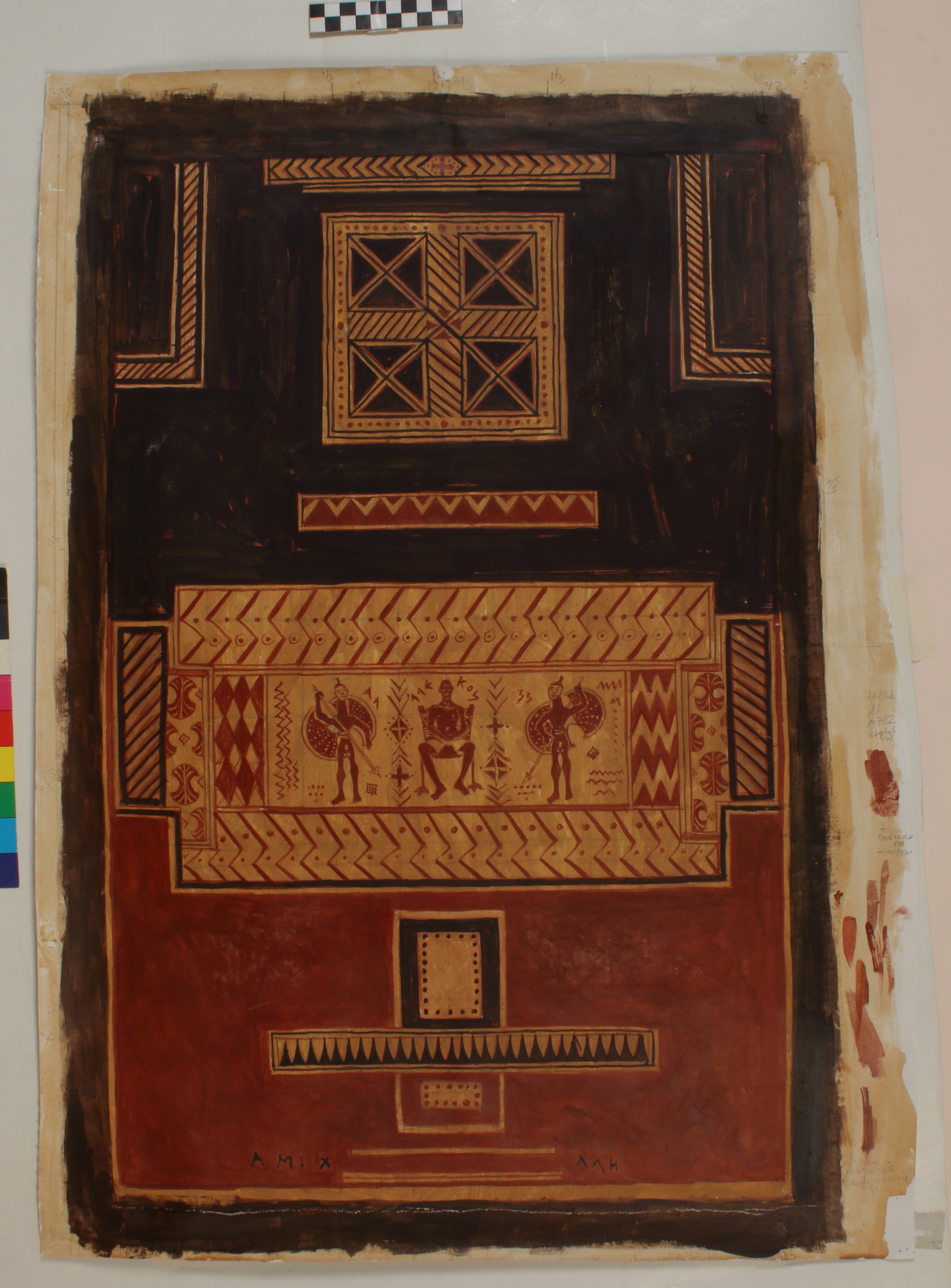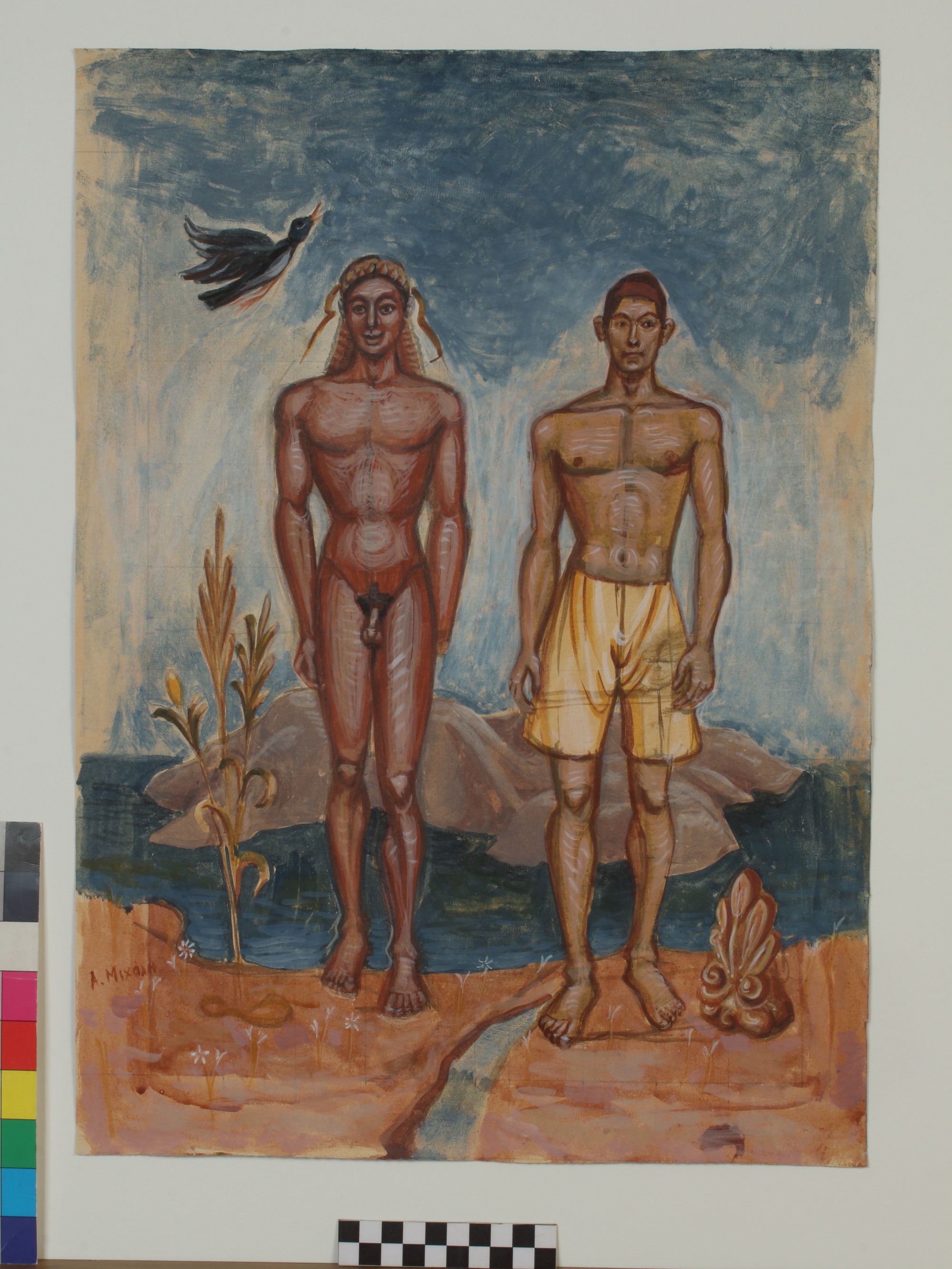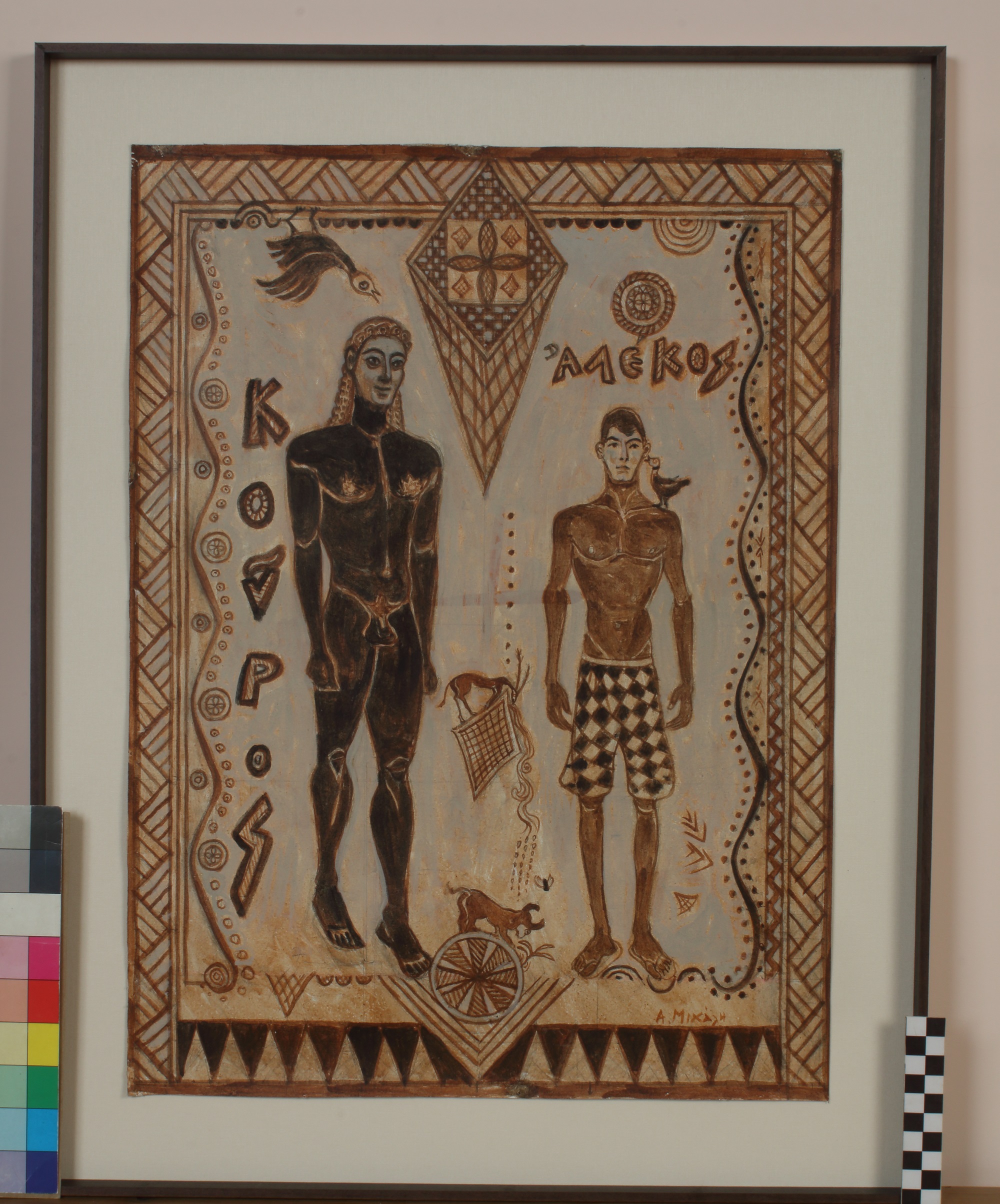 Ακόμη, αφαιρετικά ως προς την απόδοσή τους και χαριτωμένα πουλιά και νεαρά ζώα, ανάλογα με εκείνα που διακοσμούν τις λαβές των τριποδικών λεβήτων αποδίδονται πρωτότυπα σε έργα-επιτοίχια "χαλιά". Εκεί, μαζί με τους σύγχρονους νέους-μοντέλα, εντάσσεται ο περίφημος χάλκινος πολεμιστής της γεωμετρικής περιόδου από την Καρδίτσα, υπερβαίνοντας όχι μόνο τον χρόνο αλλά και τη λειτουργία για την οποία φιλοτεχνήθηκε. Χρωματικά η δημιουργός πειραματίζεται με την παλέτα των αρχαίων χρησιμοποιώντας τα χρώματα των αγγείων: υπόλευκος πηλός, ώχρες κόκκινες και κίτρινες και γανωμένο μαύρο "ντύνουν" τους Κούρους, τους κλασικούς αλλά και τους σύγχρονους. Όλα αυτά με ευαισθησία και καθαρή πρόθεση να μιλήσει η ζωγράφος στο διεθνές φιλότεχνο κοινό που επισκέπτεται το Μουσείο, με ζωγραφικούς όρους σύγχρονους, ζωντανούς. Να προσπαθήσει να μεταδώσει στον θεατή τής συλλογής της το βίωμα, το ότι η τέχνη είναι ενιαία - μια δυναμική έκφραση που υπερβαίνει χρονολογικές και τοπικές ταξινομήσεις.