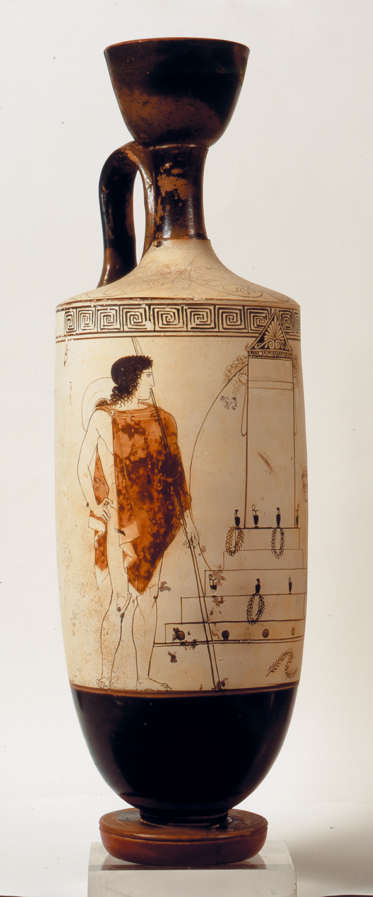 Εικ. 2: Αττική λήκυθος με παράσταση επίσκεψης σε ταφικό μνημείο. Από την Ερέτρια. Του Ζωγράφου του Bosanquet. Η φροντίδα των οικογενειακών τάφων και η μνήμη των προγονικών μορφών ήταν καθήκον των μελών ενός οίκου. Ο οίκος και το γένος αποτελούσαν τα θεμέλια μίας δημοκρατικής πόλης-κράτους, όπως η Αθήνα. Γύρω στο 440 π.Χ. (© ΥΠΠΟΑ/ΤΑΠΑ/Εθνικό Αρχαιολογικό Μουσείο, φωτογράφος: Γιάννης Πατρικιάνος).