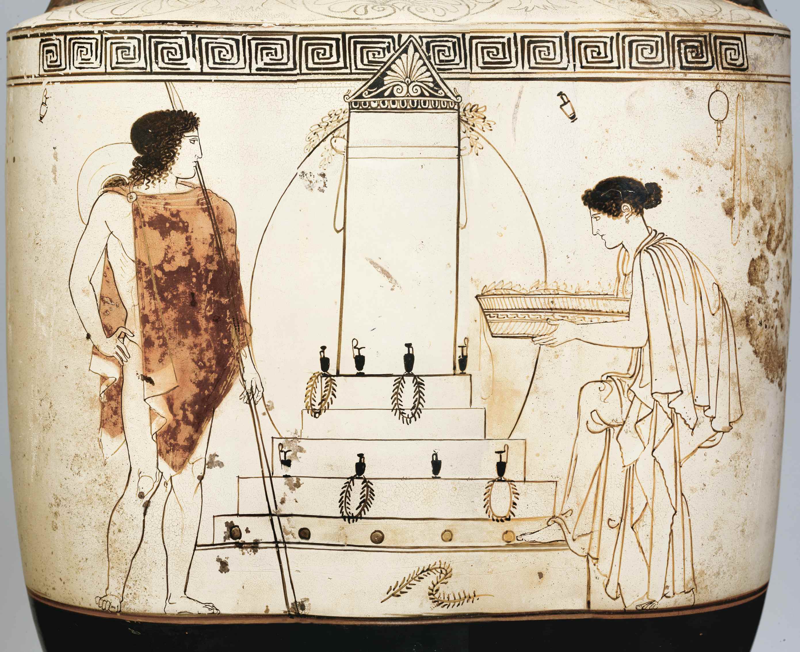 Εικ. 3. Αττική λευκή λήκυθος από την Ερέτρια (φωτογραφικό ανάπτυγμα). Επίσκεψη στον τάφο. Του Ζωγράφου του Bosanquet. Γύρω στο 440 π.Χ. (ΕΑΜ Α1935 © TAΠΑ/Εθνικό Αρχαιολογικό Μουσείο).