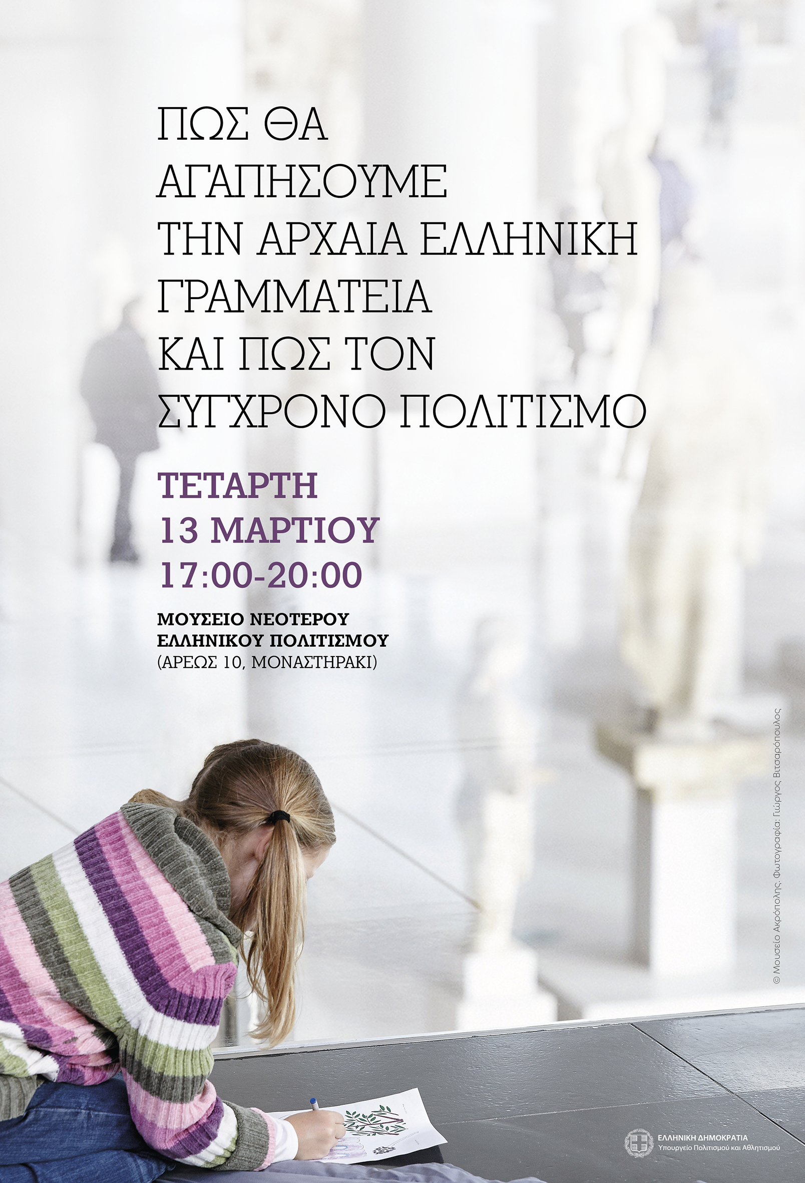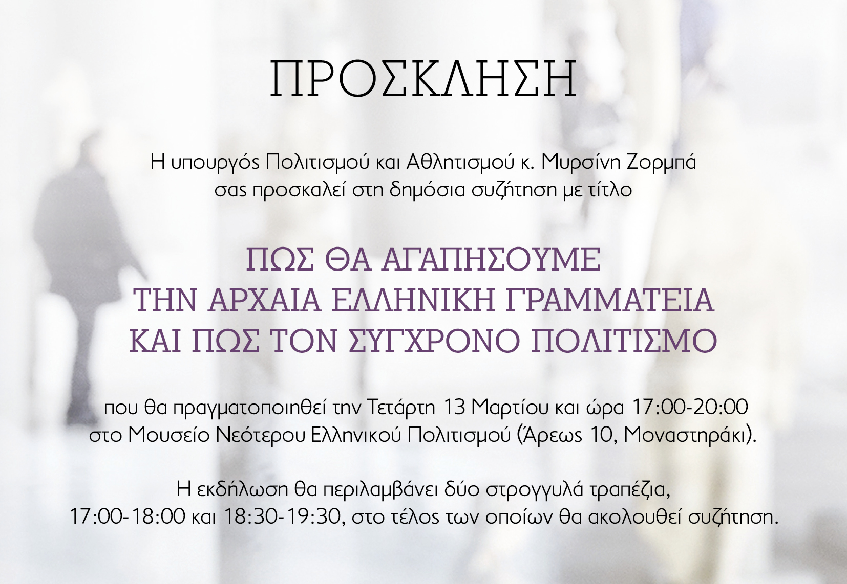 Δημόσια συζήτηση, με τίτλο "Πώς θα αγαπήσουμε την αρχαία ελληνική γραμματεία και πώς τον σύγχρονο πολιτισμό" διοργανώνει το Υπουργείο Πολιτισμού και Αθλητισμού, την Τετάρτη 13 Μαρτίου και ώρα 17:00-20:00 στο Μουσείο Νεότερου Ελληνικού Πολιτισμού (Άρεως 10, Μοναστηράκι).