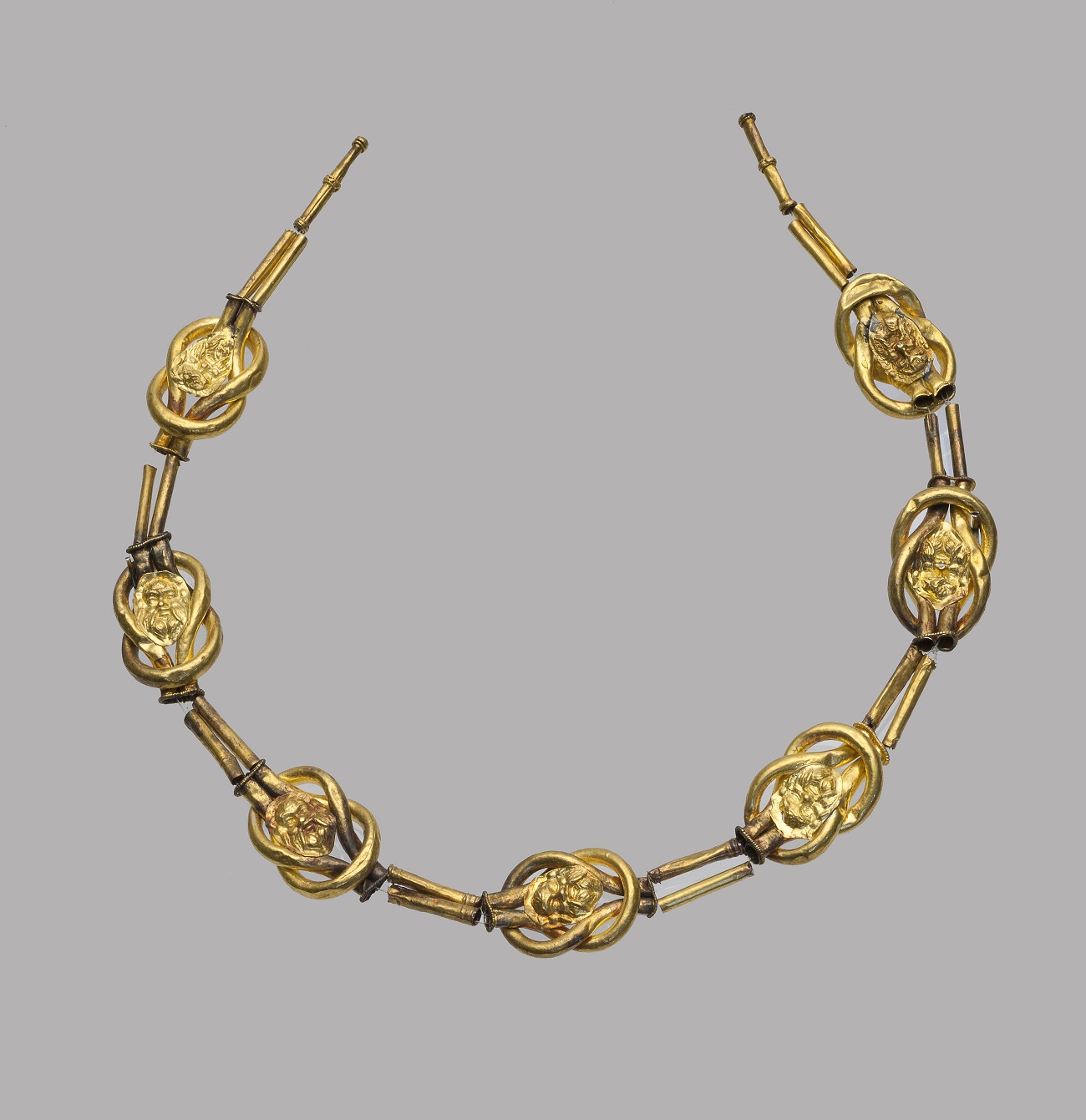 Εικ.5. Χρυσό περιδέραιο με στοιχεία σε σχήμα ηράκλειου κόμβου και κεφαλές Σειληνών (τέλη 4ου-αρχές 3ου αι. π.Χ.), © ΕΑΜ/ΤΑΠ.
