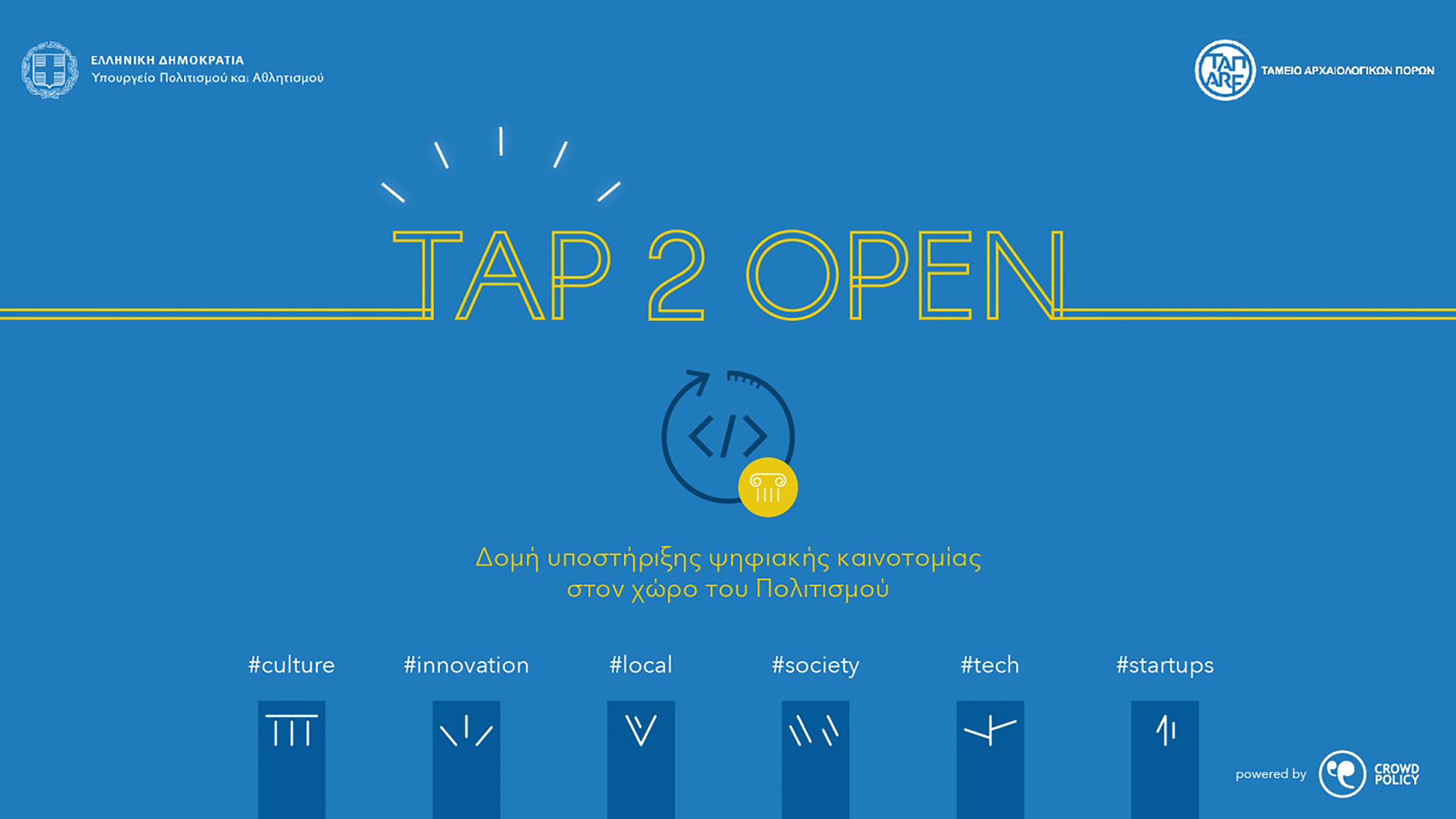Το Ταμείο Αρχαιολογικών Πόρων, υπό την αιγίδα του Υπουργείου Πολιτισμού και Αθλητισμού, στο πλαίσιο της αναπτυξιακής πολιτικής του, διοργανώνει διήμερο διαγωνισμό καινοτομίας TAP 2 OPEN Bootcamp με στόχο την ανάπτυξη καινοτόμων εφαρμογών για τη βελτίωση της εμπειρίας των επισκεπτών σε αρχαιολογικούς χώρους και μουσεία.