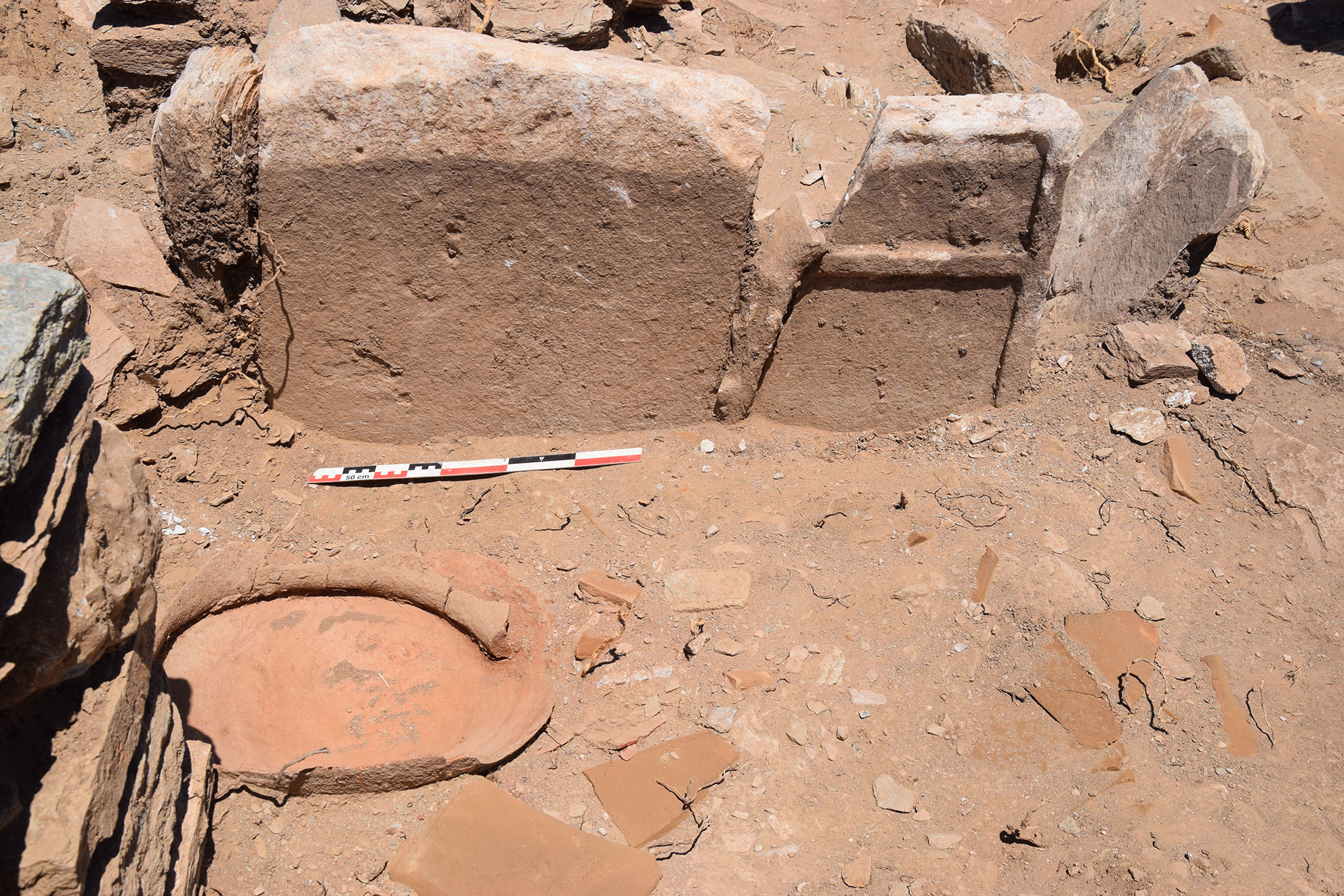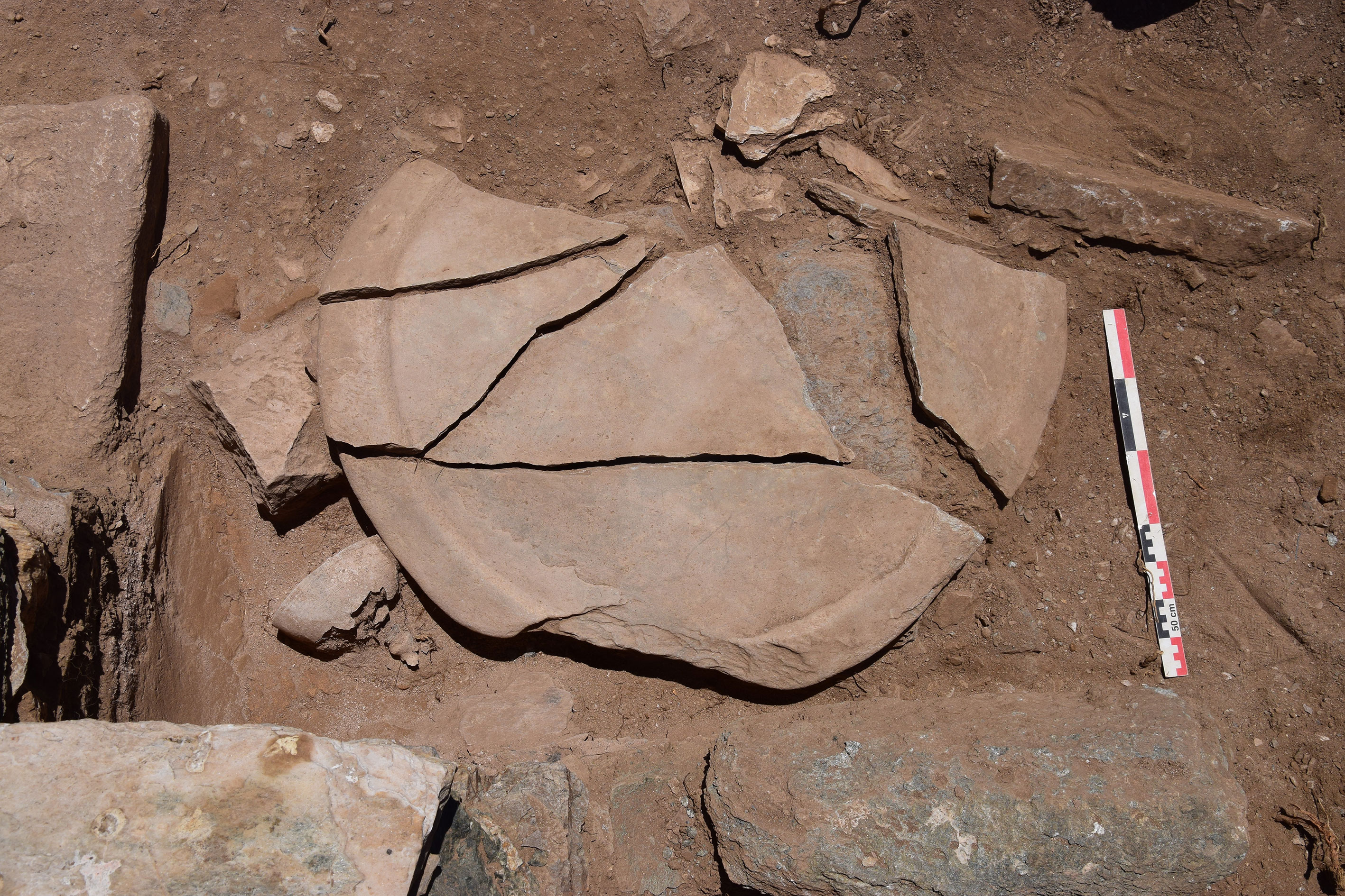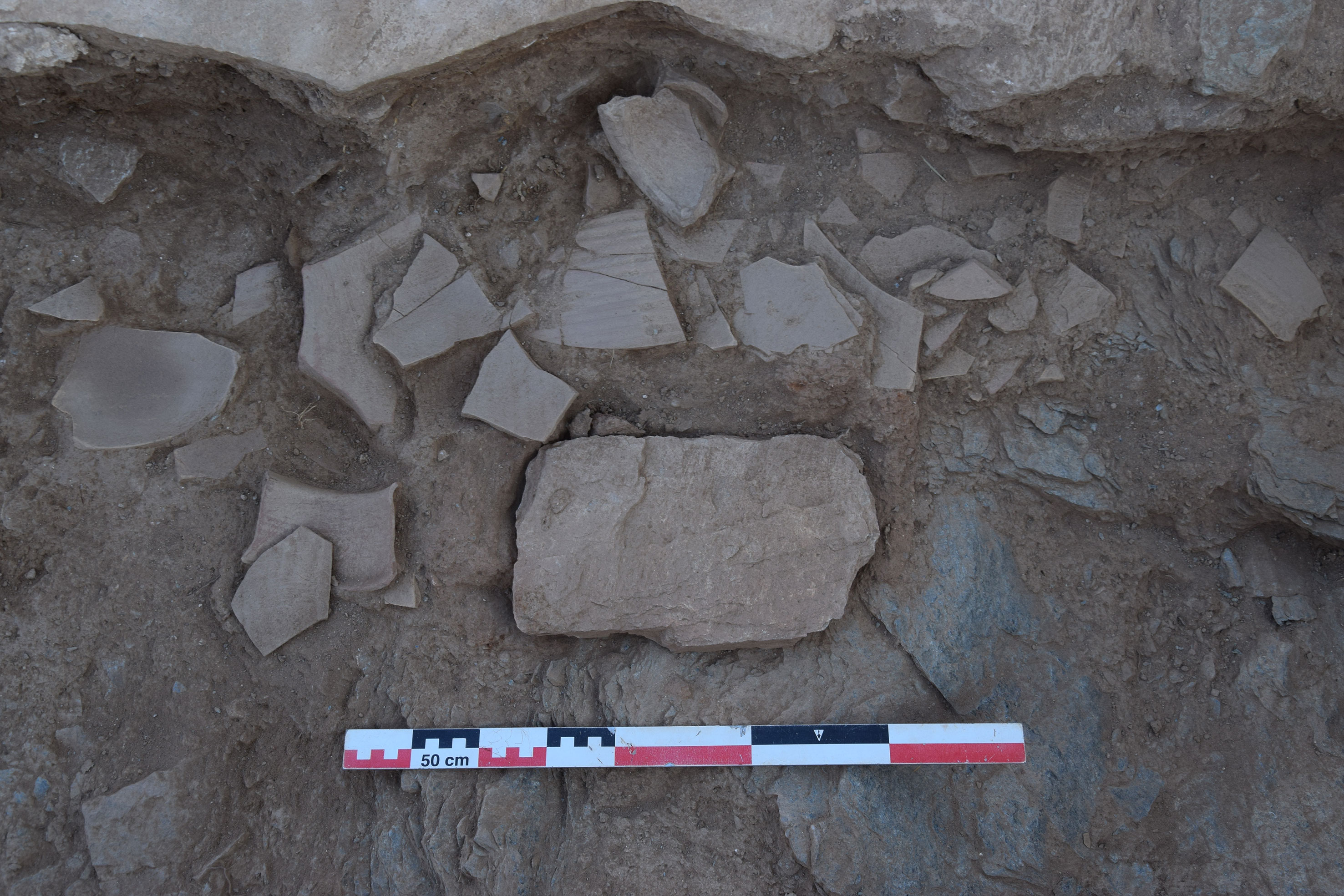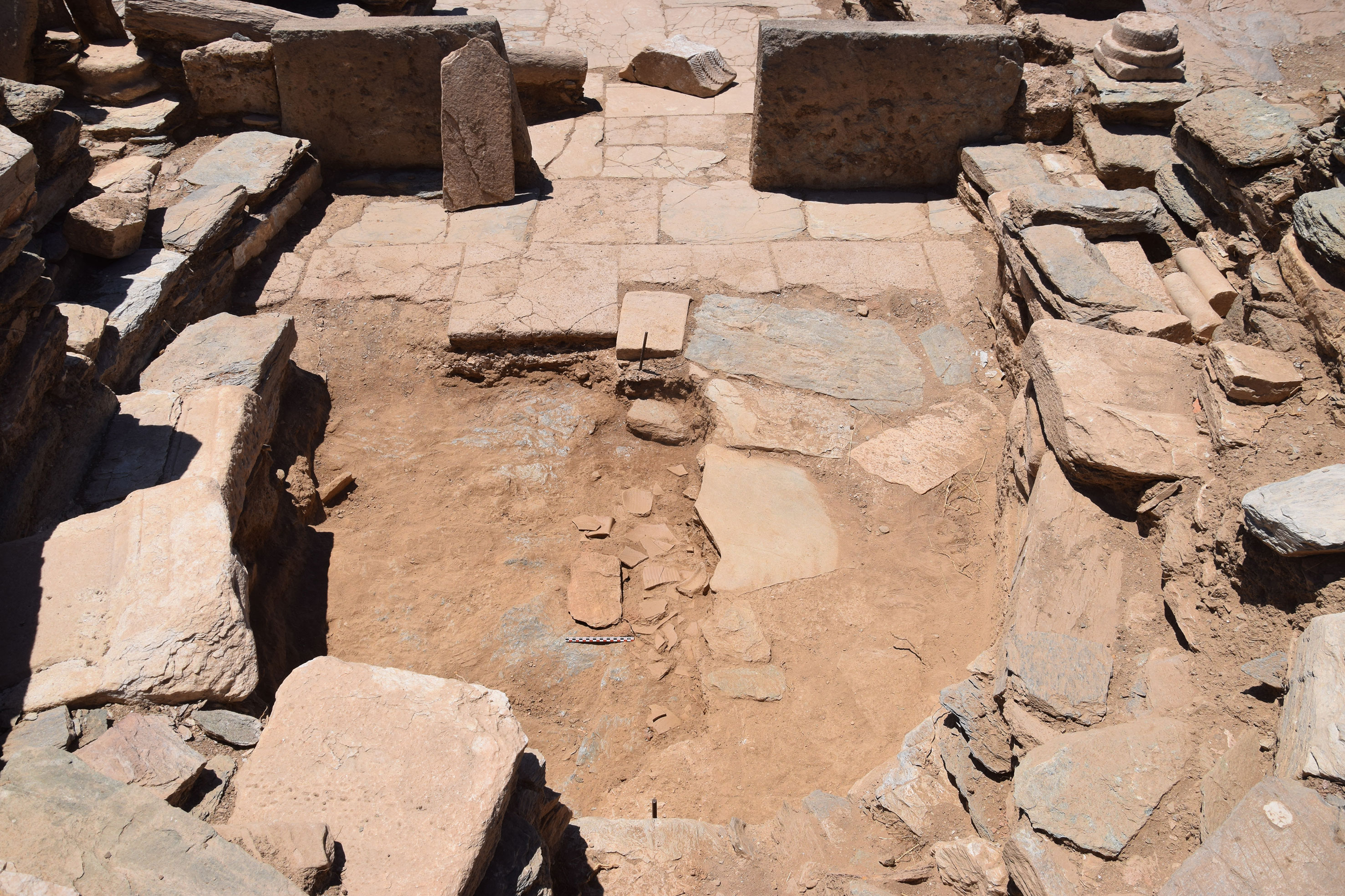 Κάτω από το διαταραγμένο δάπεδο της αψίδας ήλθε στο φως στρώμα θραυσμένων πρωτοβυζαντινών αγγείων (εικ. 15, 21): κοντόχοντρες χύτρες με καρινωτό περίγραμμα που προκαταρκτικά χρονολογούνται μάλλον στον 5ο αι., χωνοειδές στόμιο σφαιρικού αμφορέα τύπου Late Roman Amphora 2, αλλά κυρίως πληθώρα θραυσμάτων από το σώμα κυλινδρικών αμφορέων τύπου Late Roman Amphora 1 με αυλακωτή διακόσμηση που χρονολογούνται κυρίως στον 6ο αιώνα και ως τις αρχές του 7ου , και φαίνεται να οριοθετούν το terminus ante quem της οικοδόμησης της βασιλικής. Κάτω από το στρώμα αυτό και στον διαμήκη άξονα του ναού, αποκαλύφθηκε μικρό ορθογωνικό λάξευμα στον φυσικό βράχο με την μορφή θήκης με καλυπτήρια πλάκα (εικ. 15, 21-22). Πρόκειται προφανώς για το εγκαίνιο του ναού, αφού στο εσωτερικό του αποκαλύφθηκε μολύβδινο σωληνωτό αντικείμενο με περιεχόμενο που τώρα ερευνάται. Η βασιλική βρίσκεται εν λειτουργία τουλάχιστον έως τον 7ο αιώνα, χωρίς να μπορεί να αποκλειστεί και οψιμότερη χρήση της.