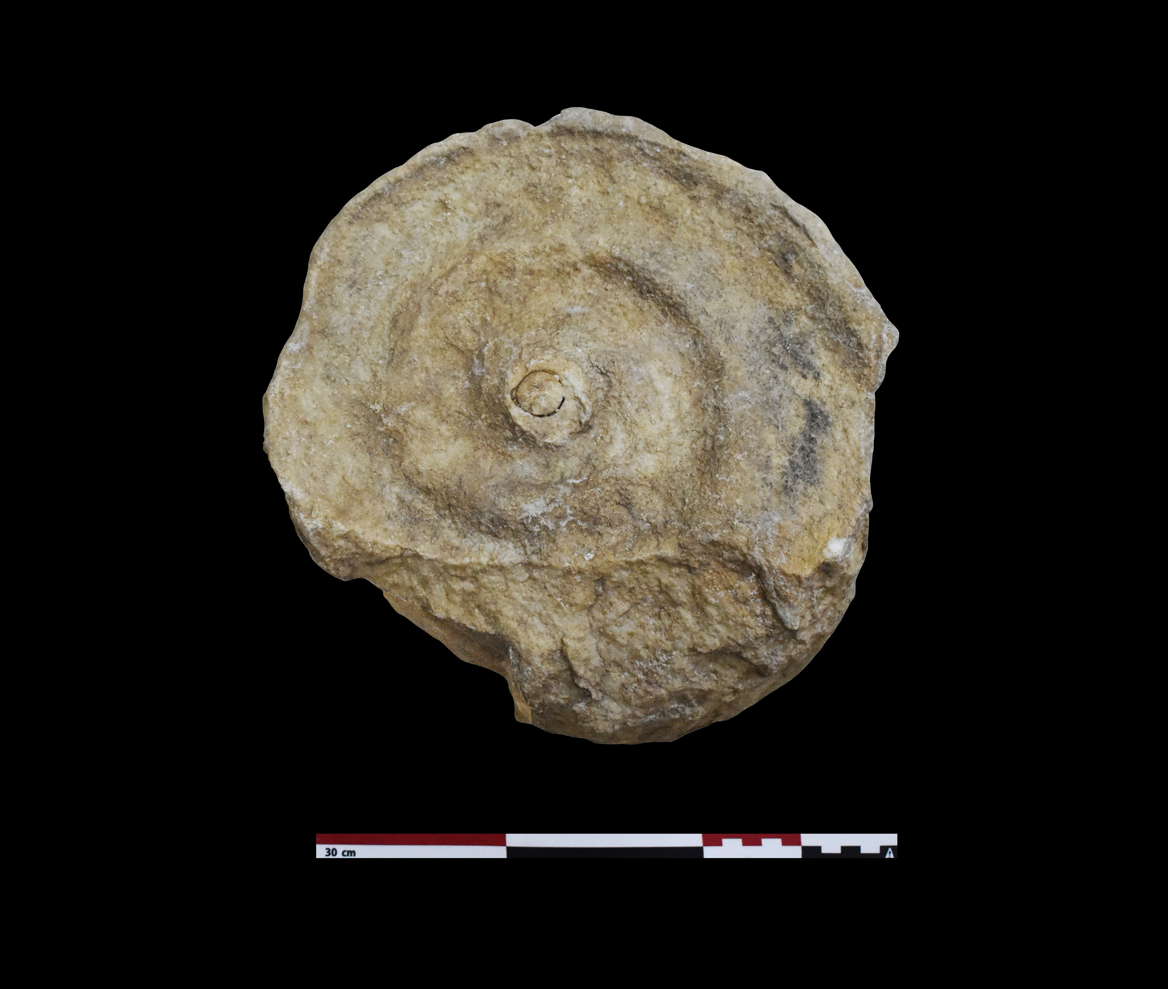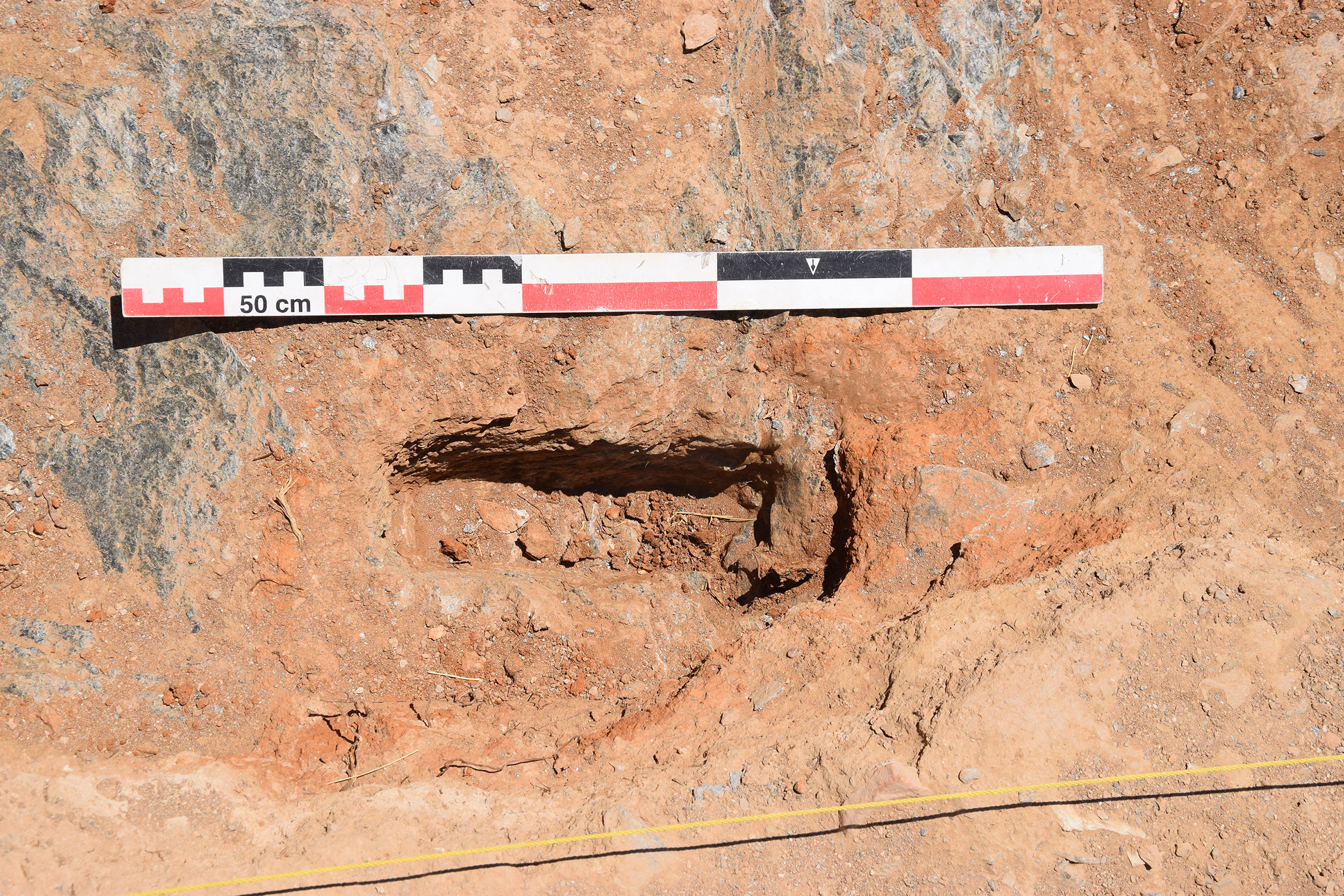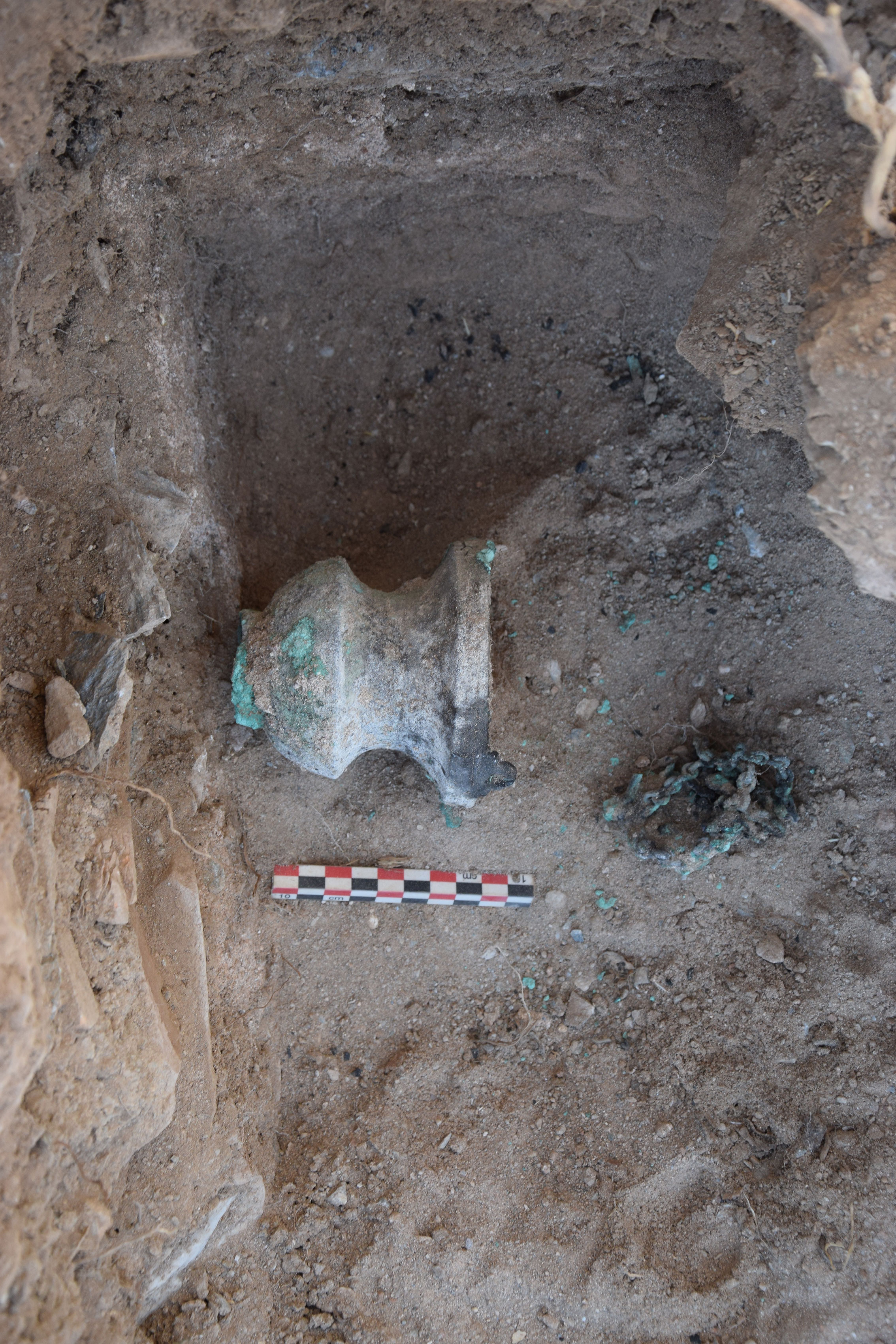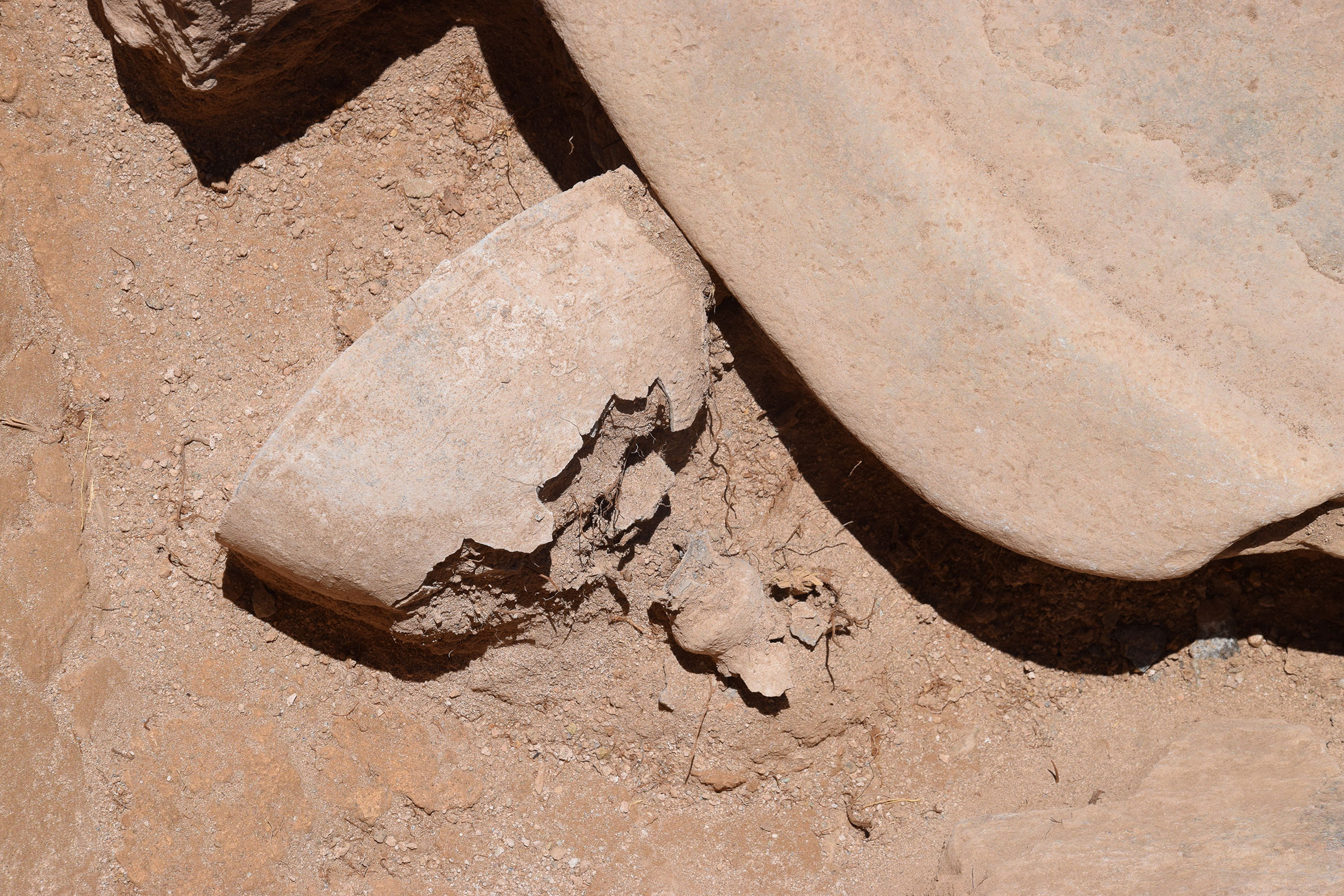 Κάτω από το διαταραγμένο δάπεδο της αψίδας ήλθε στο φως στρώμα θραυσμένων πρωτοβυζαντινών αγγείων (εικ. 15, 21): κοντόχοντρες χύτρες με καρινωτό περίγραμμα που προκαταρκτικά χρονολογούνται μάλλον στον 5ο αι., χωνοειδές στόμιο σφαιρικού αμφορέα τύπου Late Roman Amphora 2, αλλά κυρίως πληθώρα θραυσμάτων από το σώμα κυλινδρικών αμφορέων τύπου Late Roman Amphora 1 με αυλακωτή διακόσμηση που χρονολογούνται κυρίως στον 6ο αιώνα και ως τις αρχές του 7ου , και φαίνεται να οριοθετούν το terminus ante quem της οικοδόμησης της βασιλικής. Κάτω από το στρώμα αυτό και στον διαμήκη άξονα του ναού, αποκαλύφθηκε μικρό ορθογωνικό λάξευμα στον φυσικό βράχο με την μορφή θήκης με καλυπτήρια πλάκα (εικ. 15, 21-22). Πρόκειται προφανώς για το εγκαίνιο του ναού, αφού στο εσωτερικό του αποκαλύφθηκε μολύβδινο σωληνωτό αντικείμενο με περιεχόμενο που τώρα ερευνάται. Η βασιλική βρίσκεται εν λειτουργία τουλάχιστον έως τον 7ο αιώνα, χωρίς να μπορεί να αποκλειστεί και οψιμότερη χρήση της.