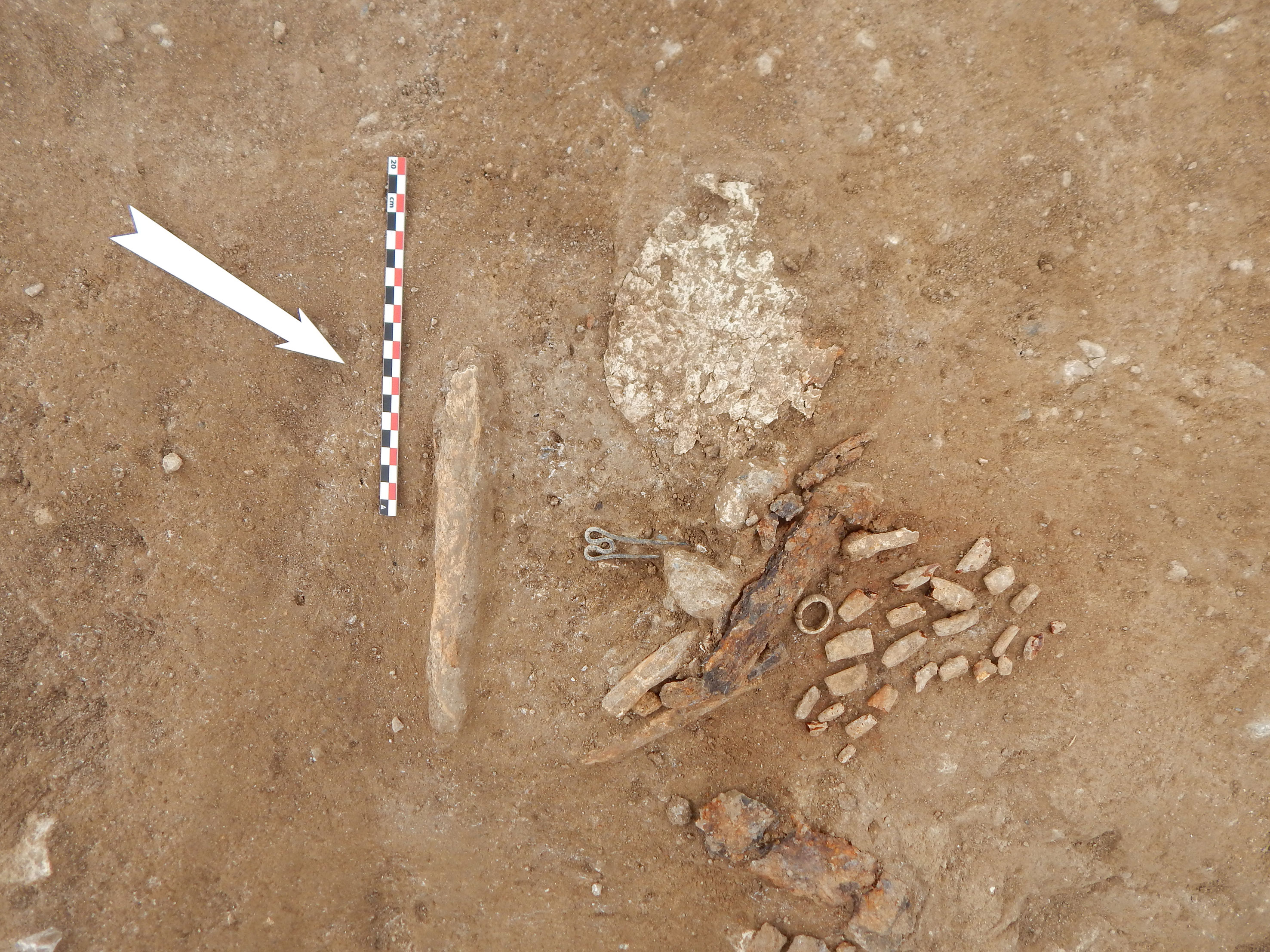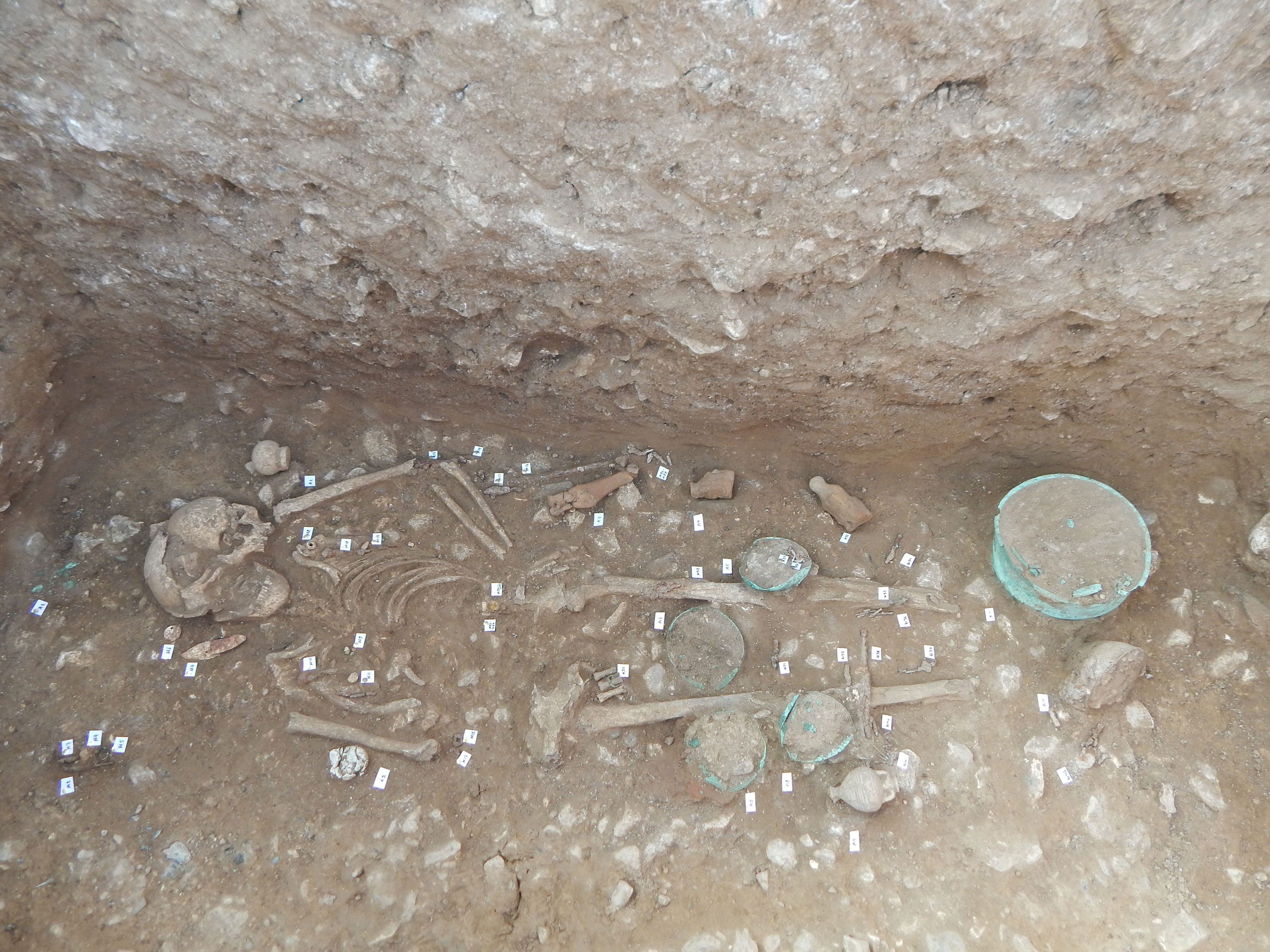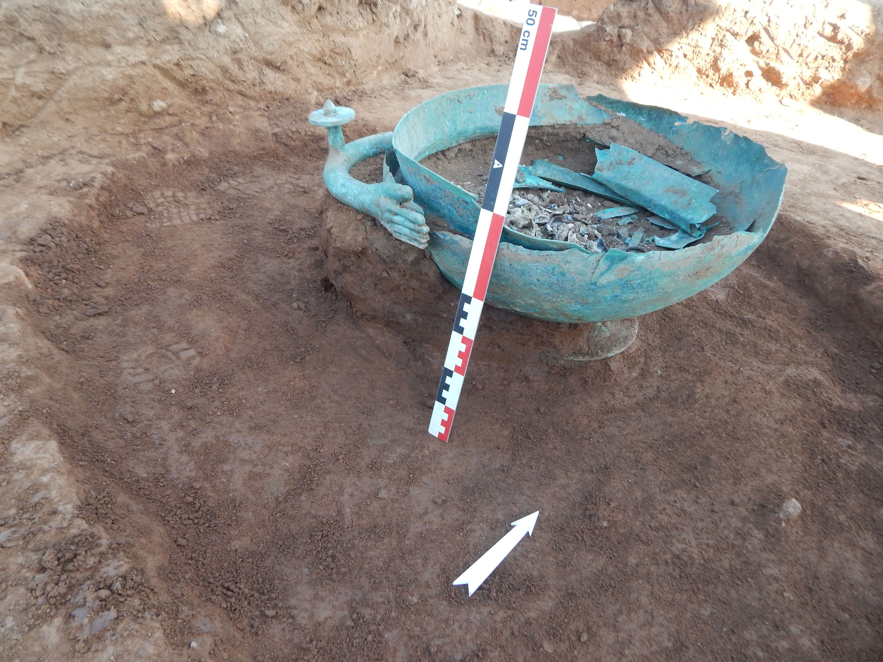 Σε πέντε ταφές εφαρμόστηκε η πρακτική της δευτερογενούς καύσης. Η μία εντοπίστηκε σε μεγάλο κρατηρόσχημο χάλκινο αγγείο, εξαιρετικό δείγμα της αρχαίας μεταλλοτεχνίας. Το αγγείο σώζεται σε σχετικά καλή κατάσταση, έχει διάμετρο 0,55μ. και φέρει πλαστική λαβή, που απολήγει σε δύο προσφύσεις με τη μορφή ανθρώπινων χεριών. Πρόκειται για δευτερογενή καύση ανδρός, και μάλιστα πολεμιστή, όπως υποδηλώνουν τα κτερίσματα: δύο σιδερένια ξίφη, δύο σιδερένια δόρατα και ένα χάλκινο κράνος "ιλλυρικού τύπου" πλαισίωναν το αγγείο, το οποίο καλυπτόταν με οριζόντια τοποθετημένη σχιστολιθική πλάκα.