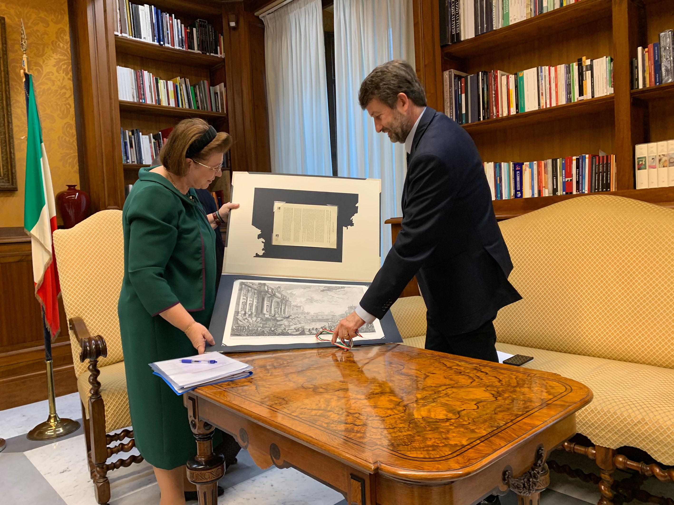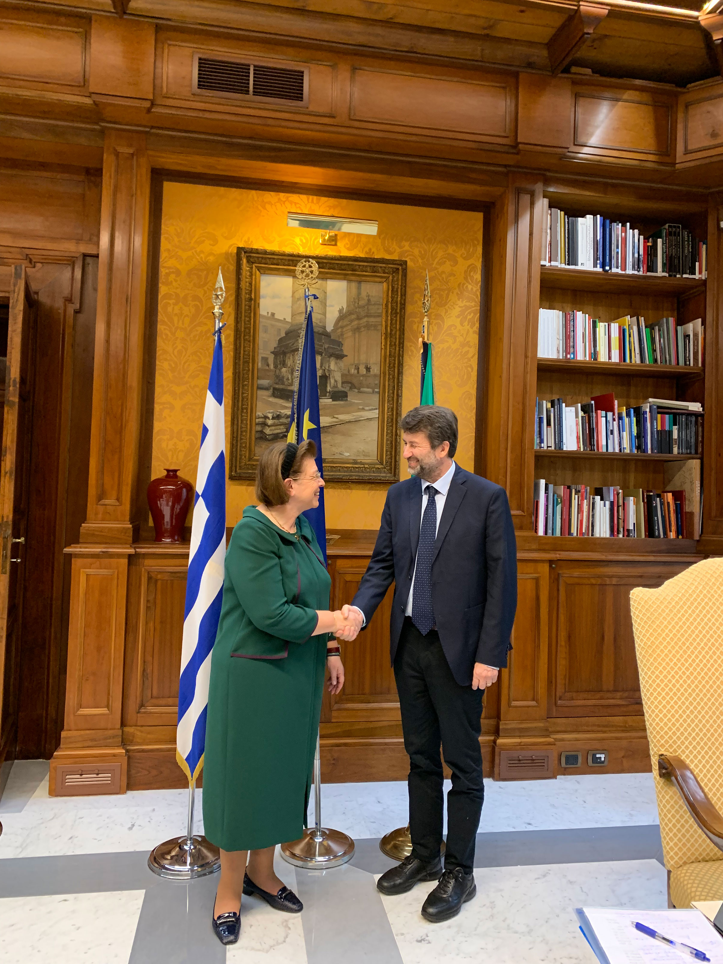 Στο μεγαλοπρεπές μέγαρο –το αρχαιότερο Λύκειο της Ρώμης- όπου στεγάζεται το Υπουργείο Πολιτισμού της Ιταλικής Δημοκρατίας, δέχθηκε ο κ. Ντάριο Φραντζεσκίνι, υπουργός Πολιτισμού και Τουρισμού της Ιταλίας, την υπουργό Πολιτισμού και Αθλητισμού, κ. Λίνα Μενδώνη, σε μια εξαιρετικά δημιουργική συνάντηση και σε ιδιαίτερα φιλικό κλίμα.
