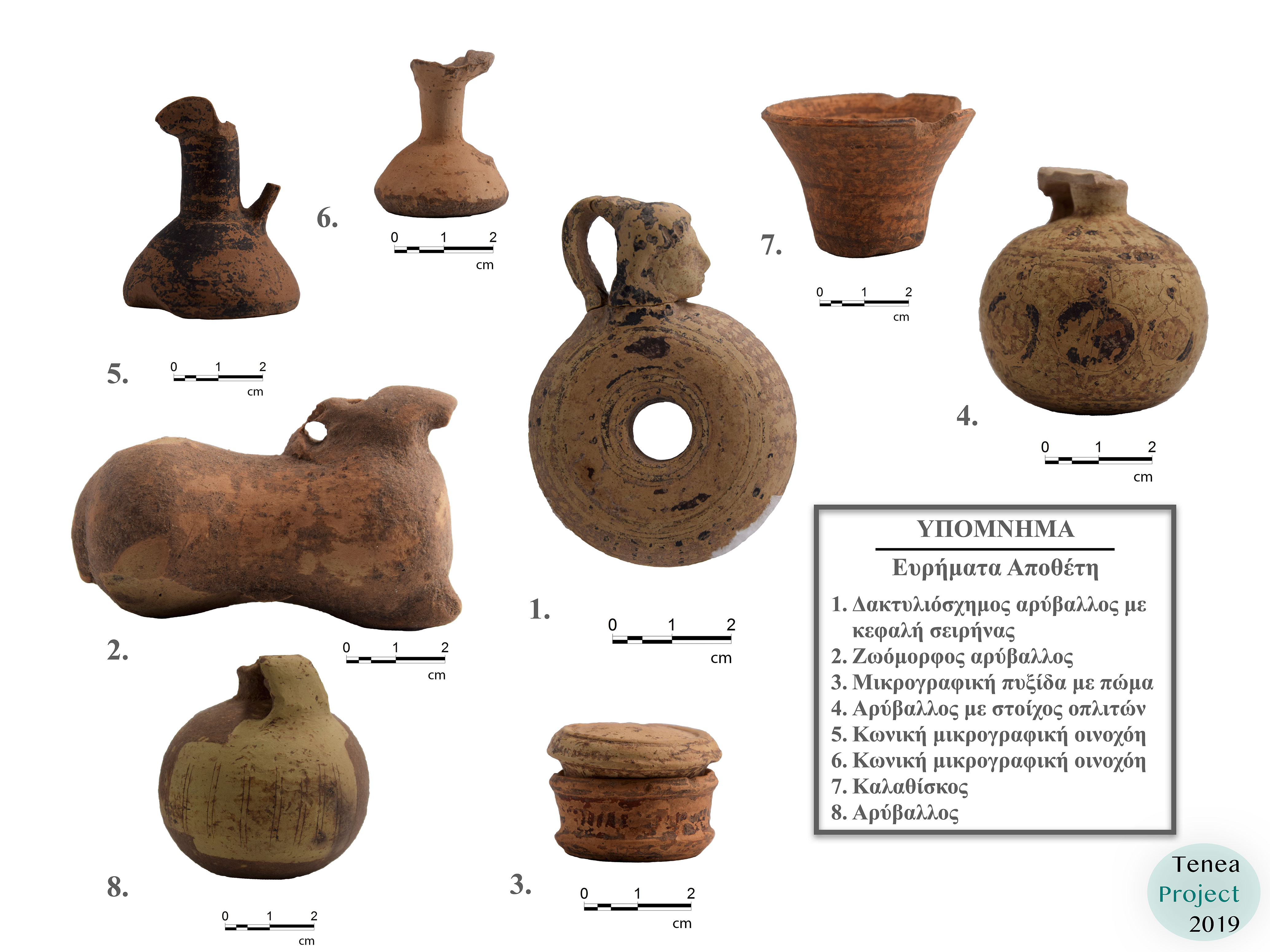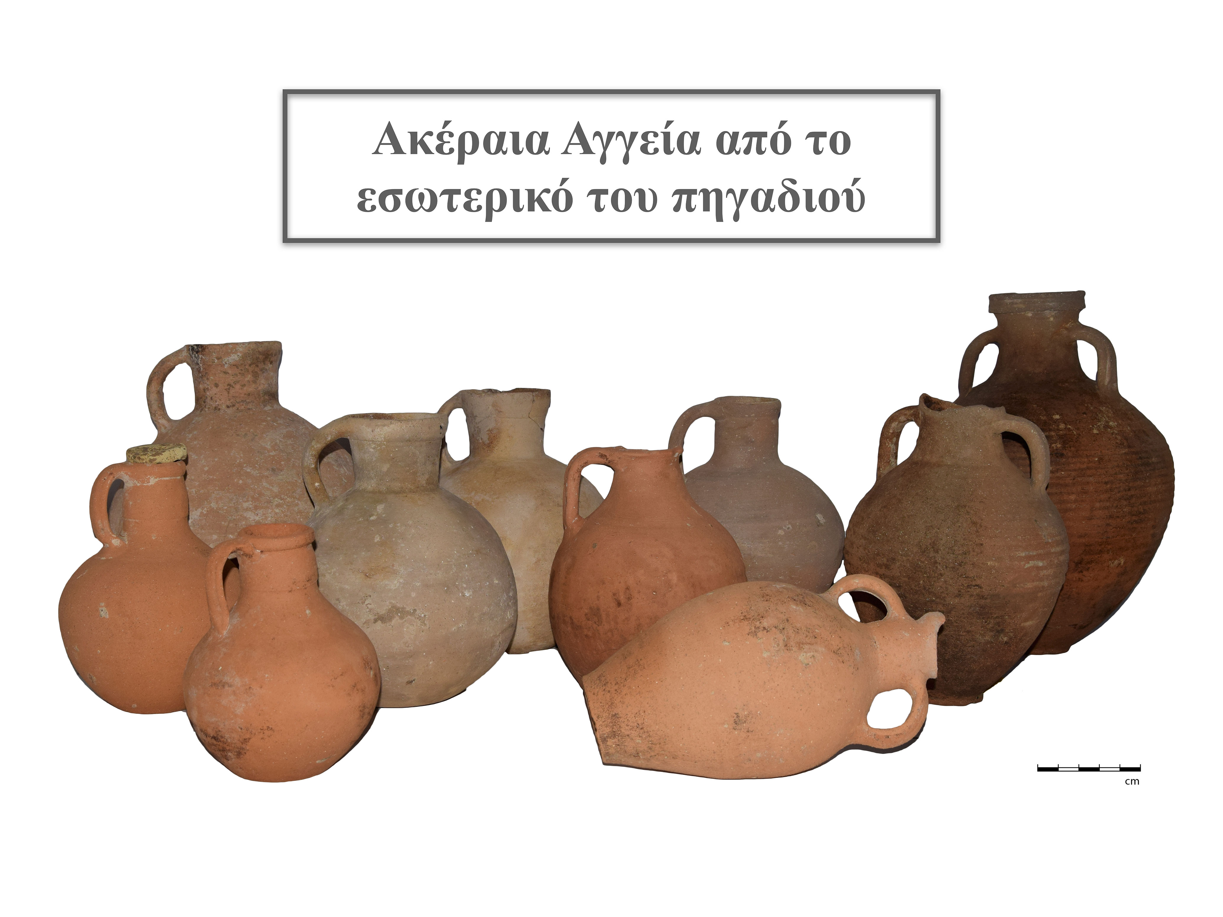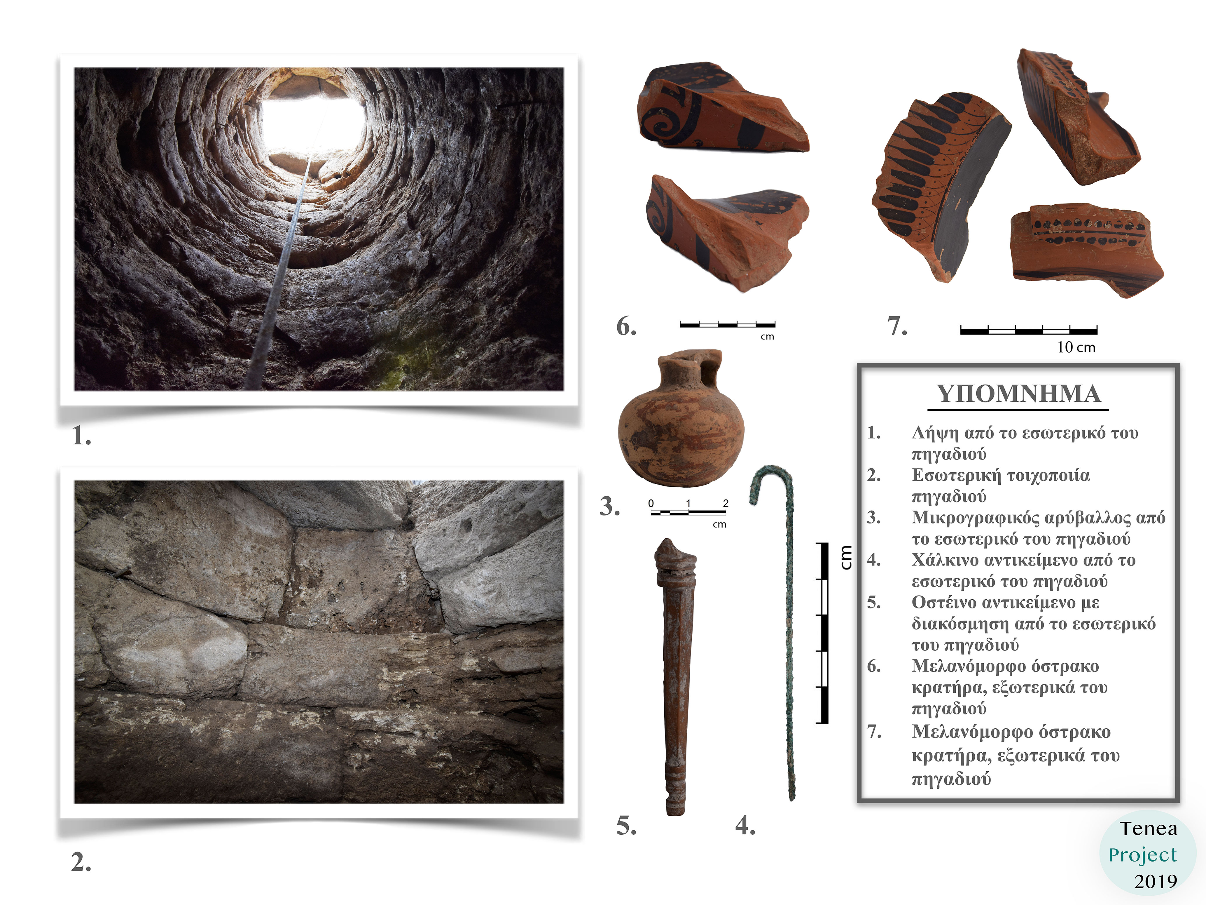 Τα ευρήματα είναι κυρίως μικρογραφικά αγγεία, τρία πήλινα ειδώλια αλόγων, ζωόμορφος αρύβαλλος, δακτυλιόσχημος αρύβαλλος με πλαστικό στόμιο που απεικονίζει σειρήνα, αστράγαλος με επίχρισμα ερυθρού χρώματος, δύο σιδερένια ομοιώματα τράπεζας κ.α. Από το εσωτερικό του πηγαδιού το οποίο διερευνήθηκε σε βάθος 15μ. ανασύρθηκε μεγάλη ποσότητα αρχιτεκτονικών μελών αρχαϊκής, κλασικής και ελληνιστικής περιόδου, επιζωγραφισμένες σίμες, βάση μαρμάρινου αγαλματιδίου στο οποίο διατηρείται κεφάλι σκύλου και πόδια ανδρικής μορφής, πιθανόν Μελέαγρου, κορμός αγαλματιδίου γυμνής γυναικείας μορφής, πιθανόν Αφροδίτης, άνω τμήμα γυμνού κορμού μαρμάρινου γυναικείου αγαλματιδίου, πάνω από 60 αμφορείς και οινοχόες, κεραμική από τους αρχαϊκούς έως τους ύστερους ρωμαϊκούς χρόνους, νομίσματα ρωμαϊκών και υστερο-ρωμαϊκών χρόνων και μια αιχμή σιδερένιου δόρατος.