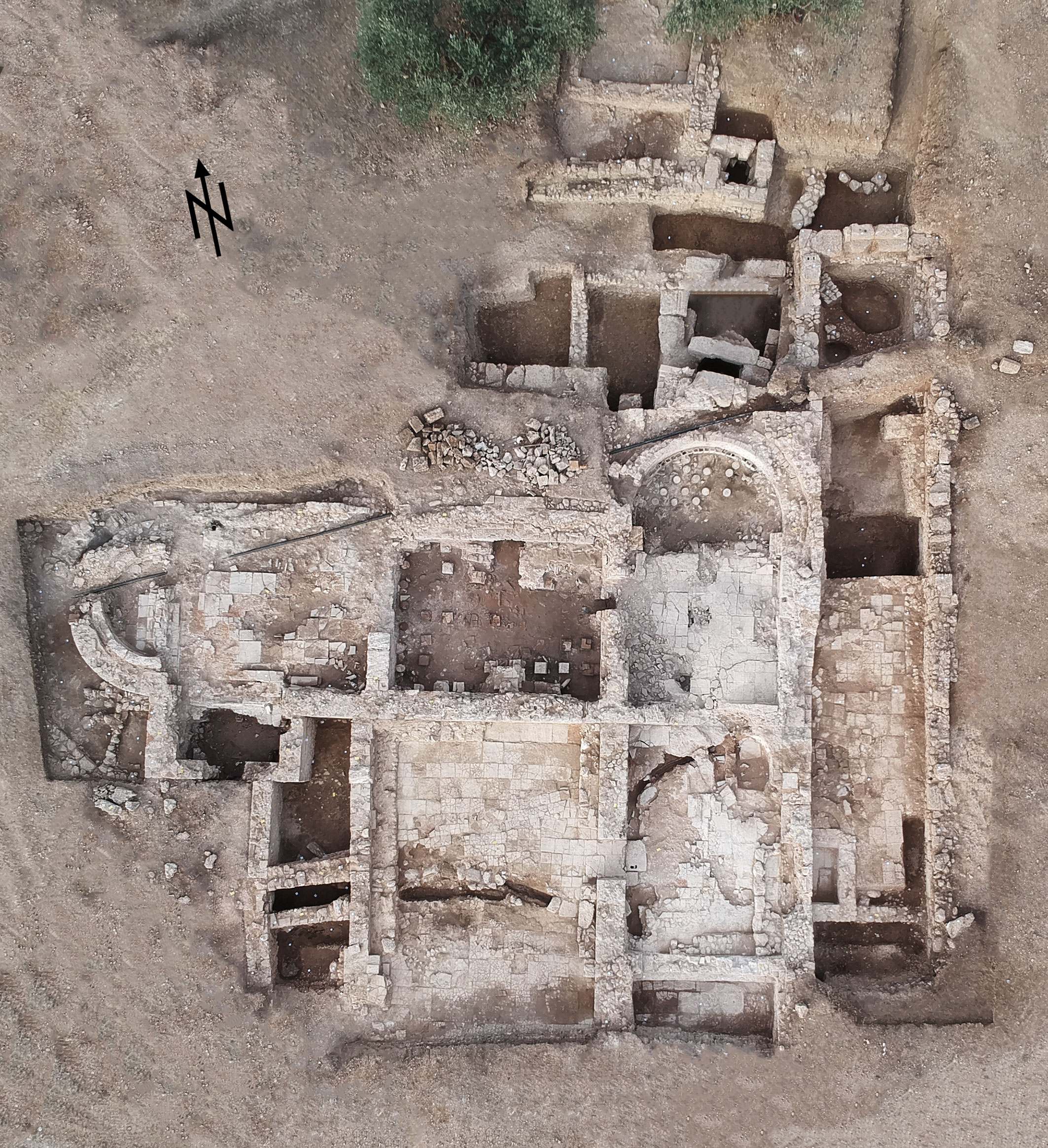 Στο νότιο ανεσκαμμένο τμήμα του συγκροτήματος εντοπίστηκαν τέσσερις αίθουσες. Από αυτές μια φέρει κτιστά θρανία περιμετρικά στους τοίχους της και διατρέχεται από κιονοστοιχεία με κατεύθυνση Α/Δ. Στο δάπεδό της βρέθηκε καταπεσμένο ιωνικό κιονόκρανο και ένας κίονας. Η αίθουσα αυτή επικοινωνεί στα ανατολικά με μια δεύτερη, η οποία φέρει λουτήρες και αυτή με τη σειρά της επικοινωνεί στα βόρεια με το caldarium και στα νότια με κολυμβητική δεξαμενή, της οποίας ένα μόνον τμήμα διερευνήθηκε φέτος. Ανατολικά αποκαλύφθηκε τρίτη αίθουσα, η οποία περιλαμβάνει λουτήρα και εκτεταμένο πήλινο δάπεδο, το οποίο διατηρείται σε εξαιρετικά καλή κατάσταση. Κάτω από το δάπεδο εντοπίστηκε μολύβδινος αγωγός στην επιφάνεια του οποίου αναγράφεται το όνομα του κατασκευαστή. Η αίθουσα αυτή εκτείνεται σε όλο το μήκος του διερευνηθέντος λουτρικού συγκροτήματος στον άξονα Β/Ν. Στο εσωτερικό της εντοπίστηκε σε στρώμα καταστροφής καταπεσμένο δωρικό κιονόκρανο και κίονας με ραβδώσεις. Τέλος, στο ΝΔ τμήμα του λουτρού βρέθηκε χώρος στον οποίο απολήγει αγωγός απορροής υδάτων που διατρέχει υποδαπέδια τις παραπάνω αίθουσες. Στον τελευταίο αυτό χώρο εντοπίστηκαν αποθέσεις χρηστικών αγγείων ελληνιστικών και ρωμαϊκών χρόνων, κεφαλή πήλινου ειδωλίου, πληθώρα θραυσμάτων γυάλινων μυροδοχείων, καθώς και αποτμήματα υαλοθετημάτων επάνω σε κονίαμα. Κατά τη διάρκεια της ανασκαφής των λουτρών βρέθηκαν 130 νομίσματα που χρονολογούνται από την ελληνιστική έως και την υστερο-ρωμαϊκή περίοδο. Ορισμένα από αυτά ανήκουν σε νομισματικούς θησαυρούς.