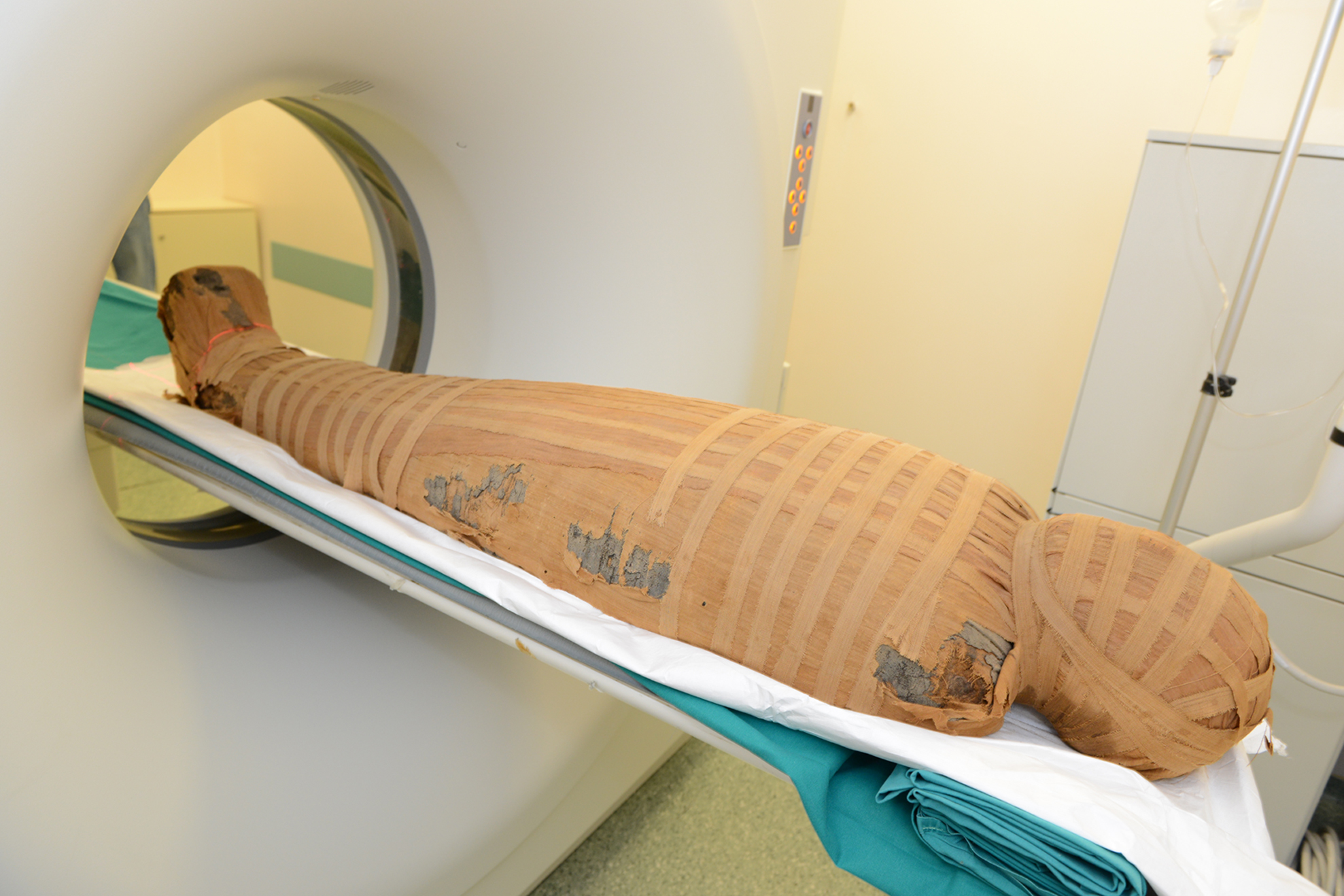 Εικ. 2. Η Μούμια του Σηχέμ, ενήλικα άνδρα 20-30 ετών, την ώρα που εισέρχεται στον αξονικό τομογράφο του Ιατρικού Αθηνών © Υπουργείο Πολιτισμού & Αθλητισμού/ΕΑΜ-Όμιλος Ιατρικού Αθηνών, φωτογράφος Ελ. Α. Γαλανόπουλος