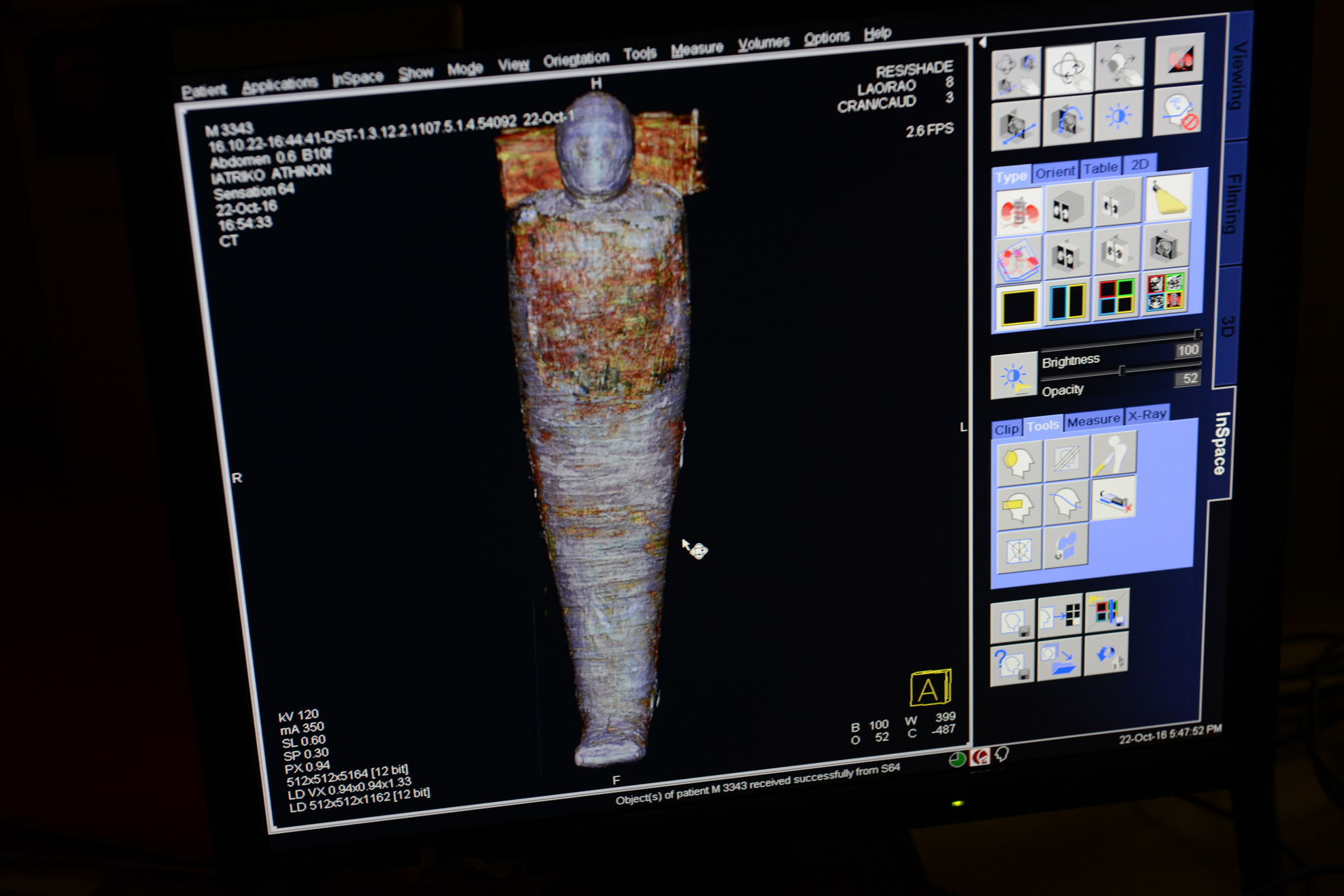 Εικ. 3. Εικόνα από τον αξονικό τομογράφο του Ιατρικού Αθηνών, στην οποία διακρίνεται η περίδεση της μούμιας του Σηχέμ, υπόδειγμα πολυτελούς ταρίχευσης, με βάση τις μαρτυρίες του Ηρόδοτου. © Υπουργείο Πολιτισμού & Αθλητισμού/ΕΑΜ- Όμιλος Ιατρικού Αθηνών, φωτογράφος Ελ. Α. Γαλανόπουλος