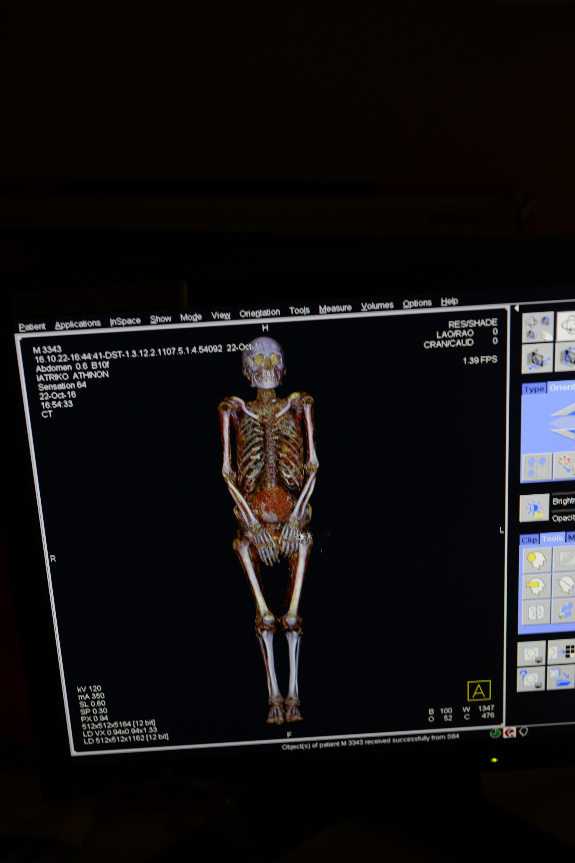 Εικ. 4. Εικόνα από τον αξονικό τομογράφο του Ιατρικού Αθηνών, στην οποία διακρίνεται ο σκελετός της μούμιας του Σηχέμ. © Υπουργείο Πολιτισμού & Αθλητισμού/ΕΑΜ-Όμιλος Ιατρικού Αθηνών, φωτογράφος Ελ. Α. Γαλανόπουλος