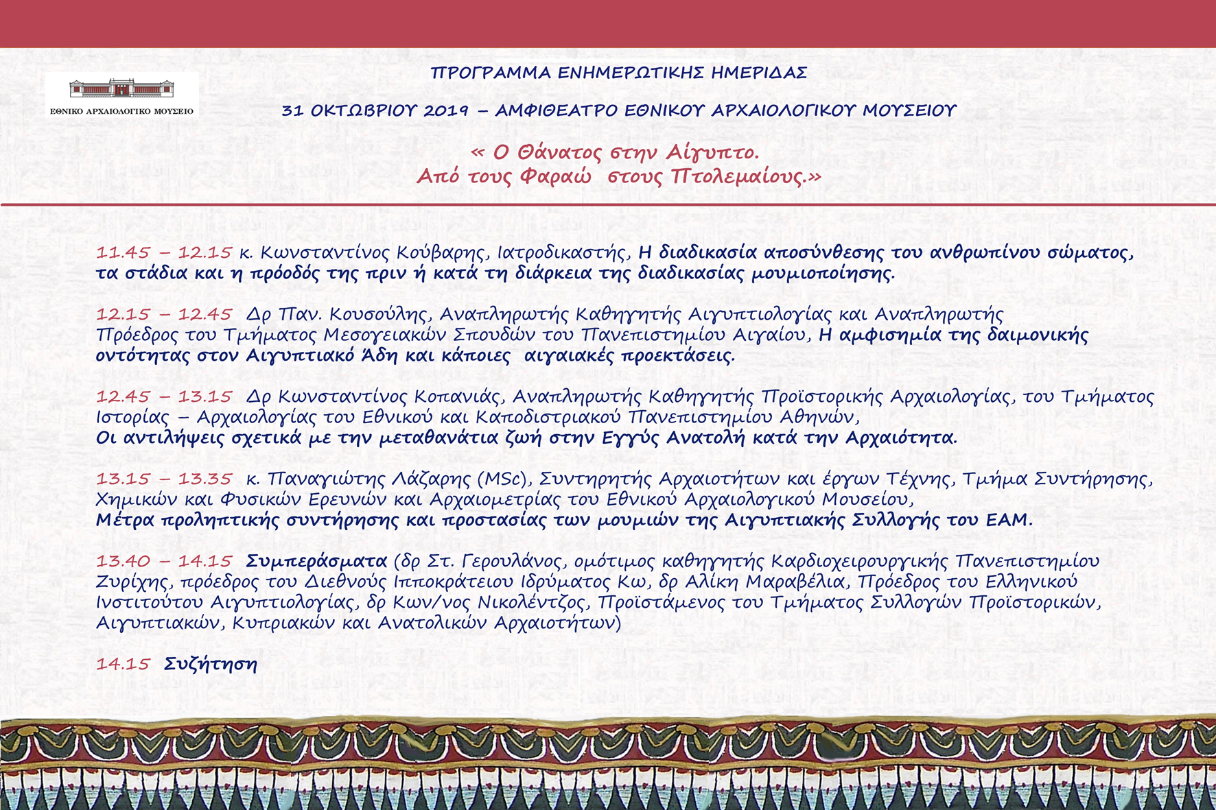 Η Ημερίδα πρόκειται να πραγματοποιηθεί στο αμφιθέατρο του Εθνικού Αρχαιολογικού Μουσείου την Πέμπτη 31 Οκτωβρίου 2019 και ώρα 09.00–14.15, με τη συμμετοχή έγκριτων επιστημόνων από τον χώρο της Ιατρικής, της Αιγυπτιολογίας–Αρχαιολογίας, της Συντήρησης Αρχαιοτήτων και της Ιατροδικαστικής. Οι ομιλητές θα φωτίσουν πολλές πτυχές των εθίμων ταφής και των δοξασιών των Αρχαίων Αιγυπτίων, ενώ θα παρουσιασθούν και οι σχέσεις της Αιγύπτου με το Αιγαίο και τη Μέση Ανατολή.
